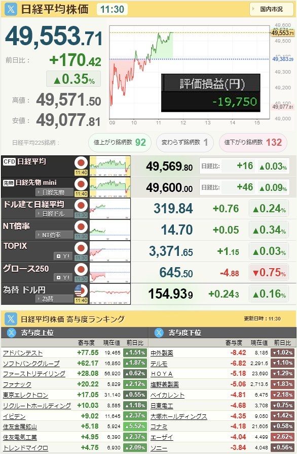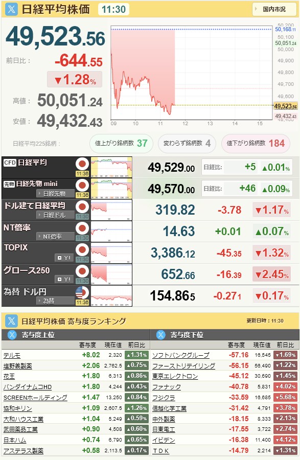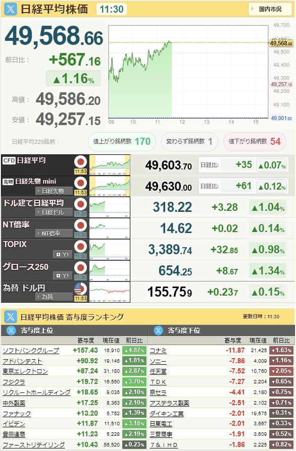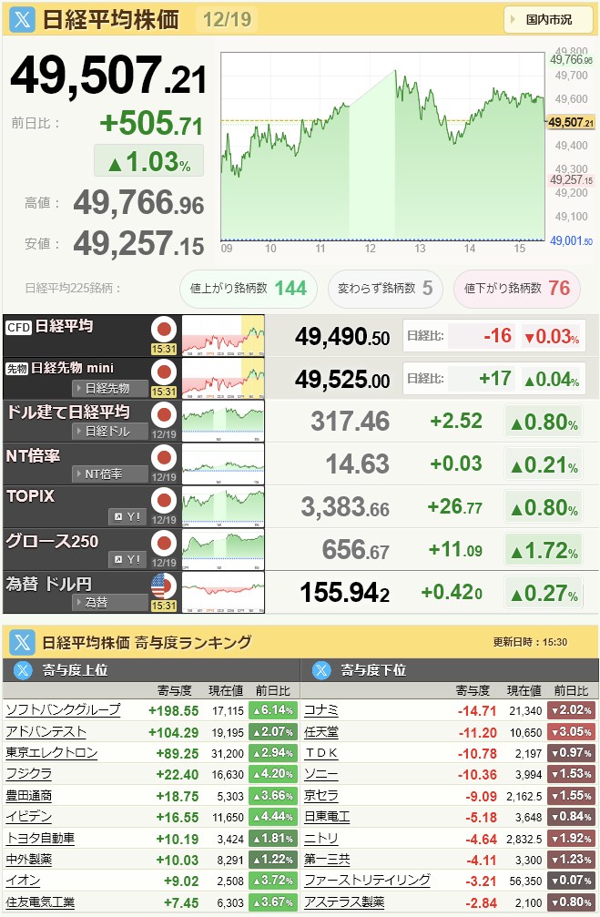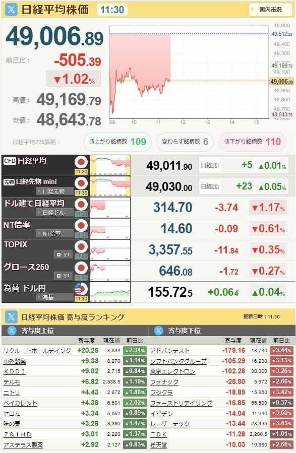 日経平均49,507.21+505.71+1.03%[15:30]米ドル/円155.93+0.39+0.25%[15:30]