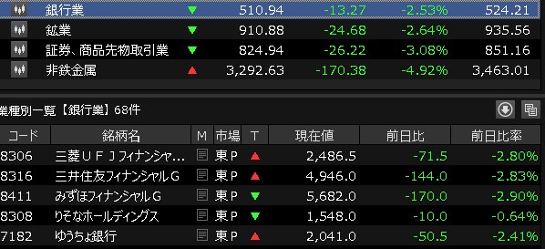 銀行株やったな。買うのは銀行株やったわ。この日経の上げは何が上げてんのかわからんかったけど、まぁソフトバンクなんやろうけど・・・銀行株が強いわ。全然下げへんやんけ・・・ワイ見てたとき三井住友5000やったのに@5027になってるわ。今日は三井ESやったな。買わないときこそ上げる株なんやで・・日本製鋼所見て見逃してたわ。