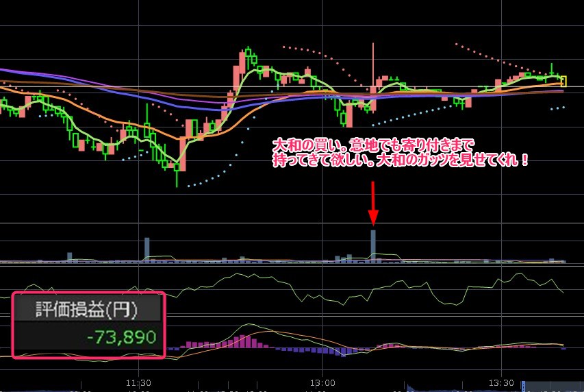 僅かに・・・含み益になって、そして含み損になって・・・この辺りを値固めしたらあとは上げていくだけやね。含み益って書こうとしたら含み損に・・・9:26