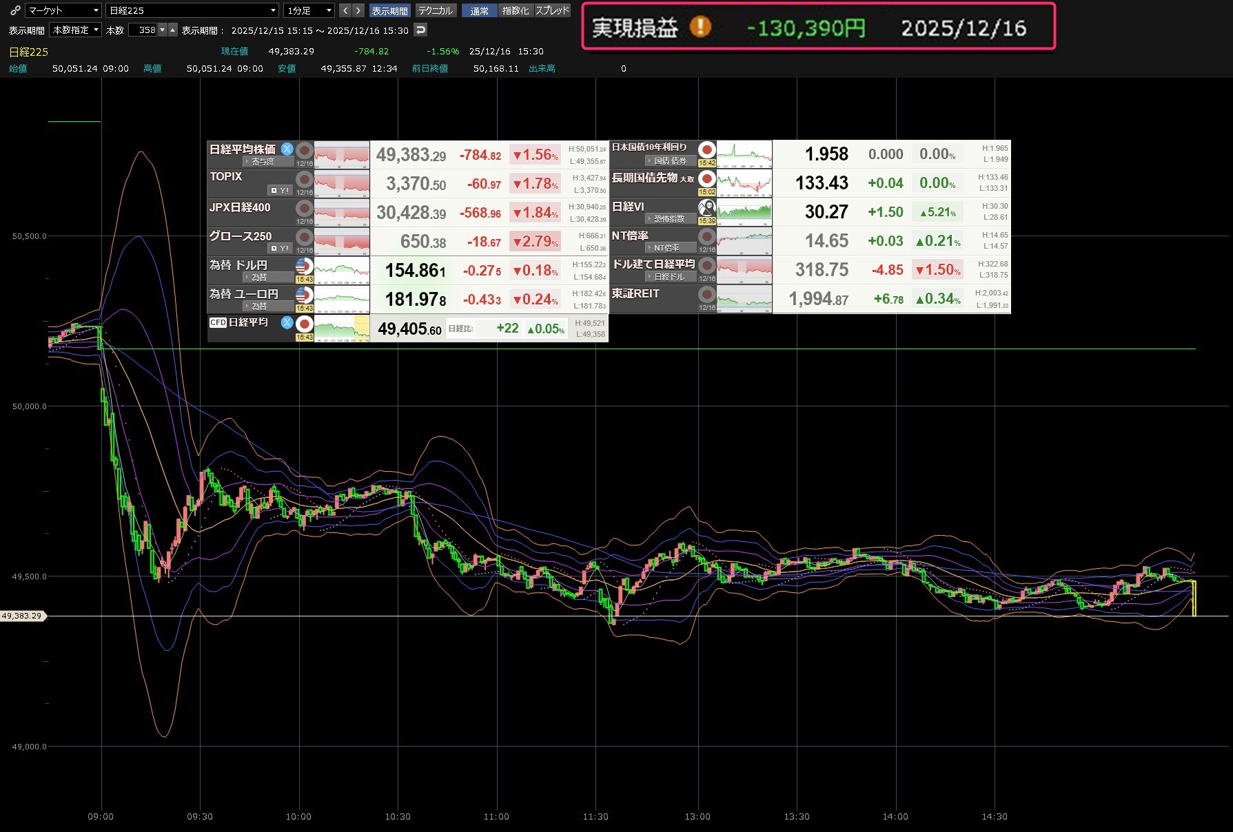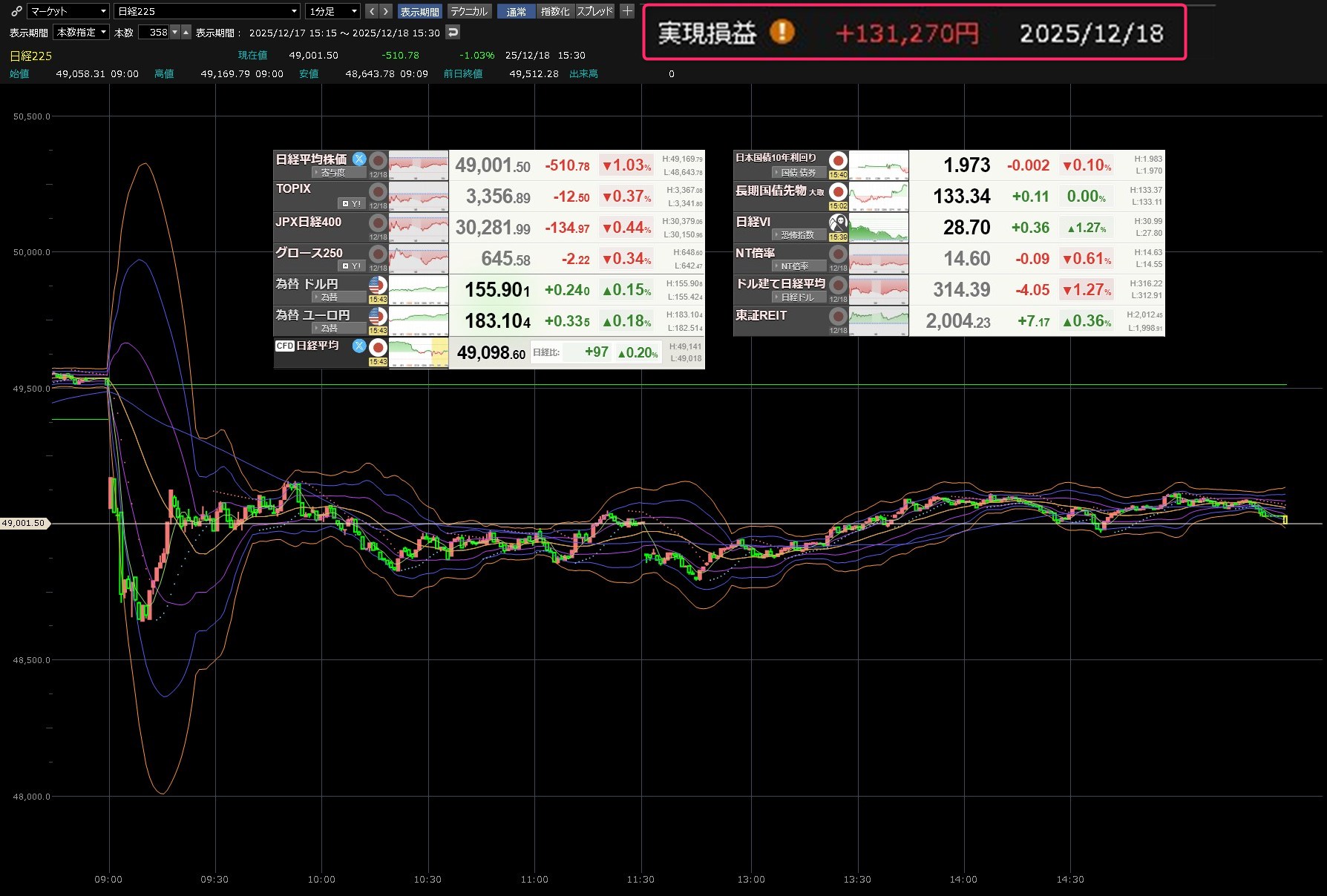 今日は寄り付きで日本製鋼所を買いそびれて、上がったところで買ってしまい買い物に言っているスキに、はしごを外されて散々な目に会いました。いろいろ反省を活かして次につなげていかんとあかんねって思いながら、本日のデイトレ結果と日経平均の1分足は以下のとおりです。