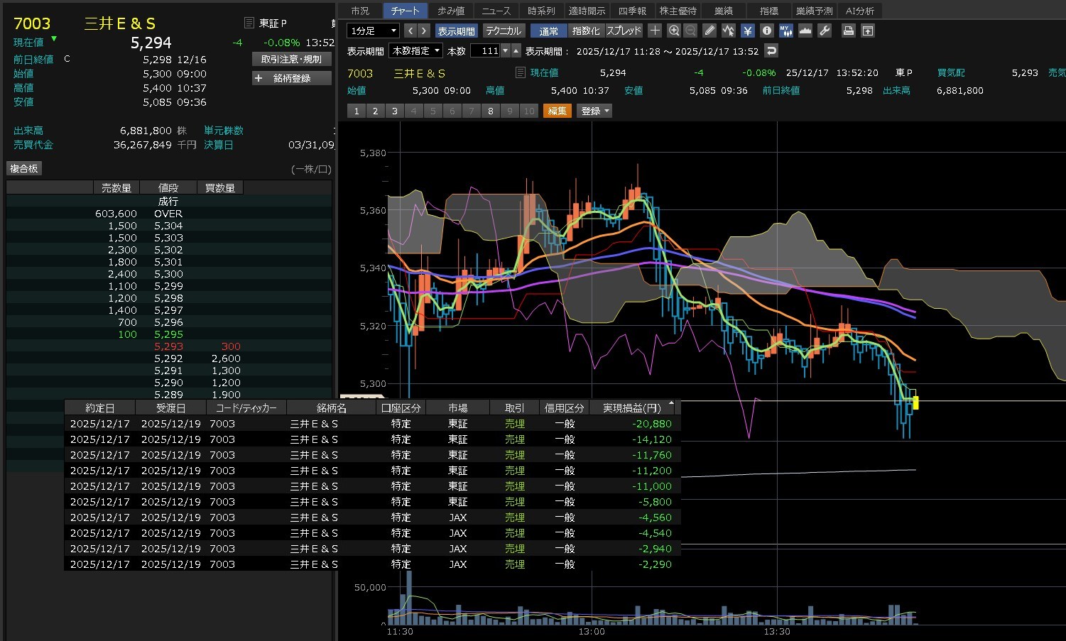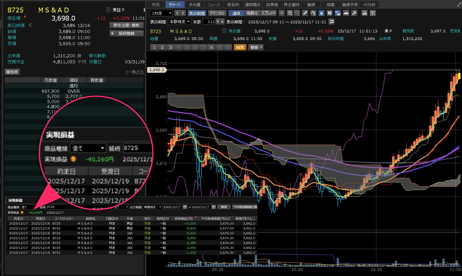 今月一気にマイナスになりました。クボタ・・・日本製鋼所・・・そしてMS&AD・・・三井ES・・・そして安川電機・・・ロスカットばかりです。その間に小さくデイトレしてましたが、それは勝てたんや。大きく買うと負けたんや。つまりはそういうことや。なんて思いながら、本日のデイトレ結果と日経平均の1分足は以下のとおりです。