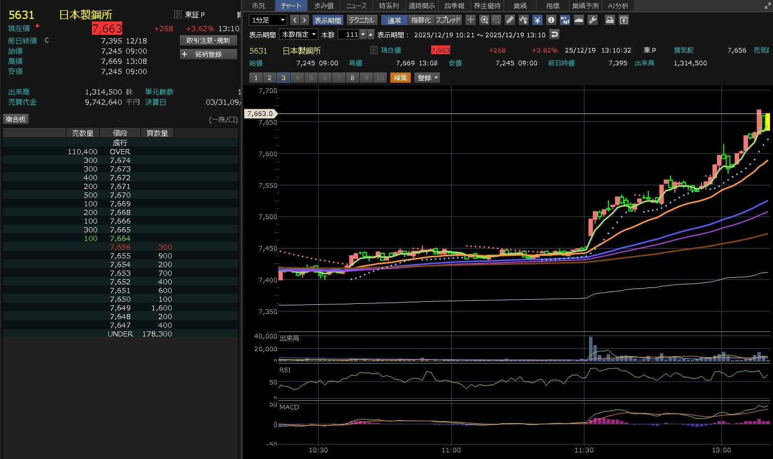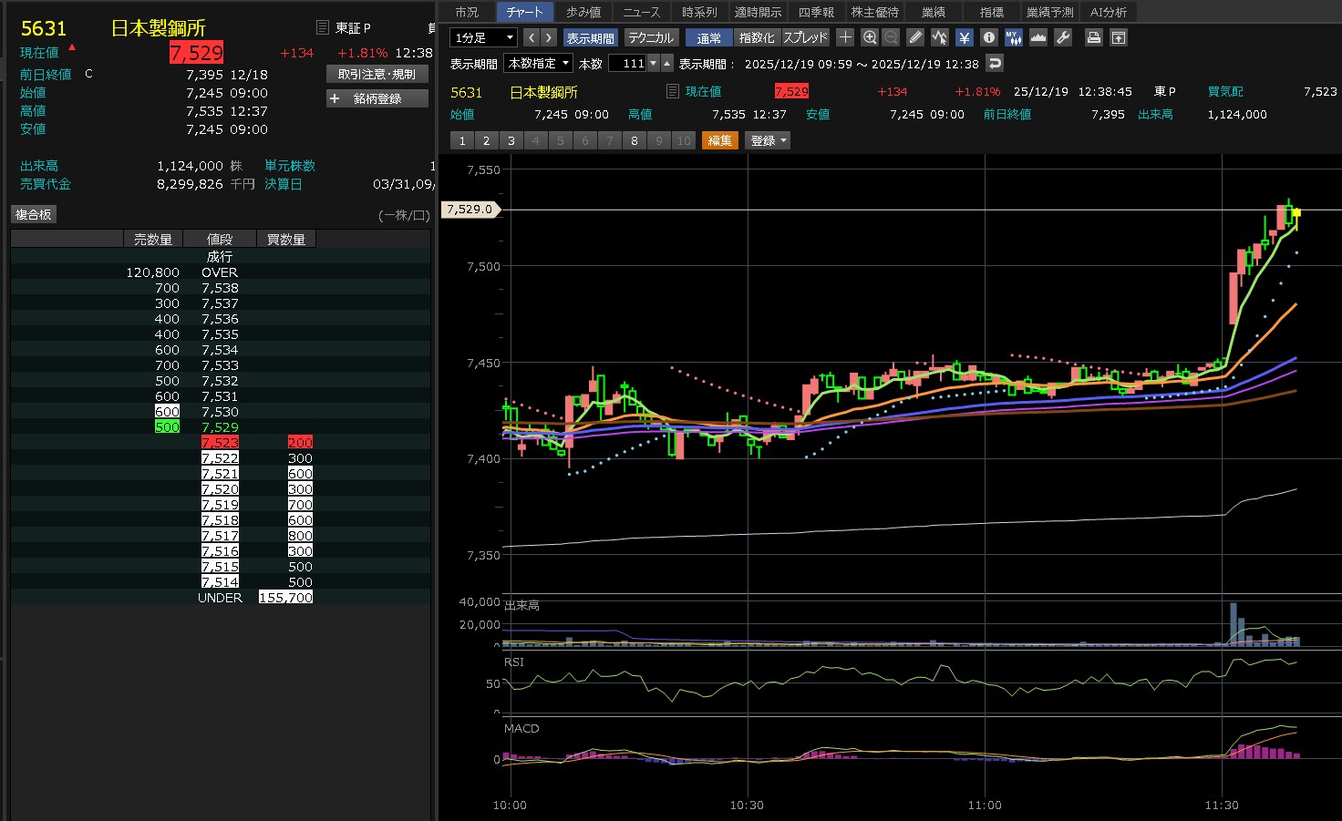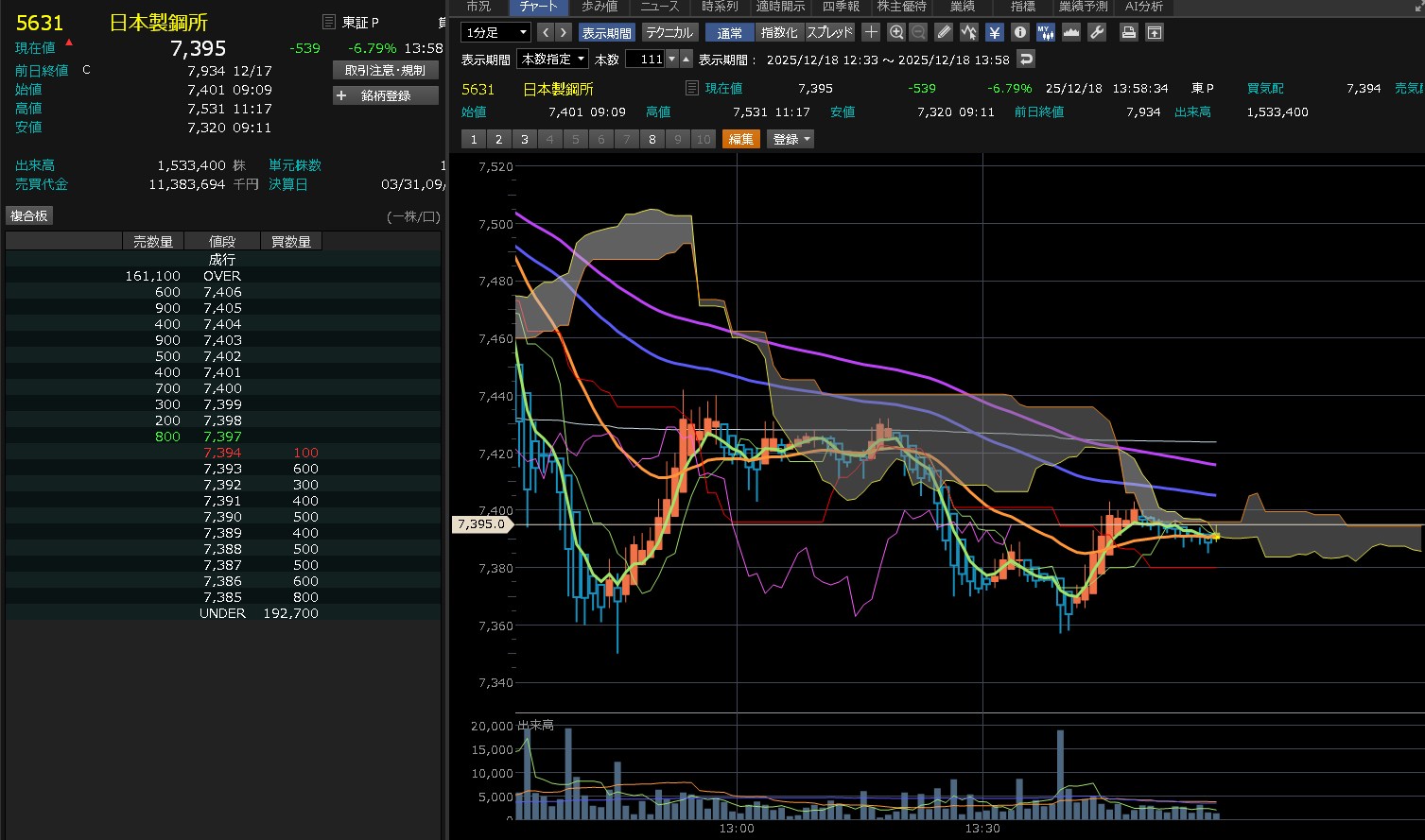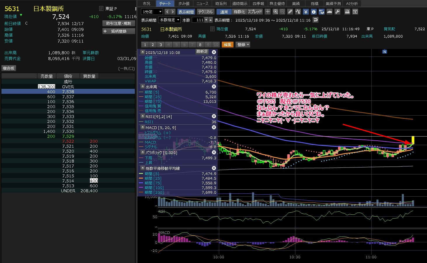 日経がずんずん上げてきたのに・・日本製鋼所は全然上げないわ。7450を超えられないな。これ・・・そして後場はズドンが来るねん。わかってんねん。だから追加購入してないねん。7450が大きな壁やなって思ってしまうぐらい弱いな。売りたいやつ多すぎ!あ、ワイもか(´・∀・`)エヘヘ それにしても売買代金がそれなりに多いねん。