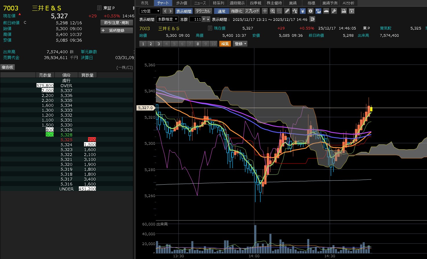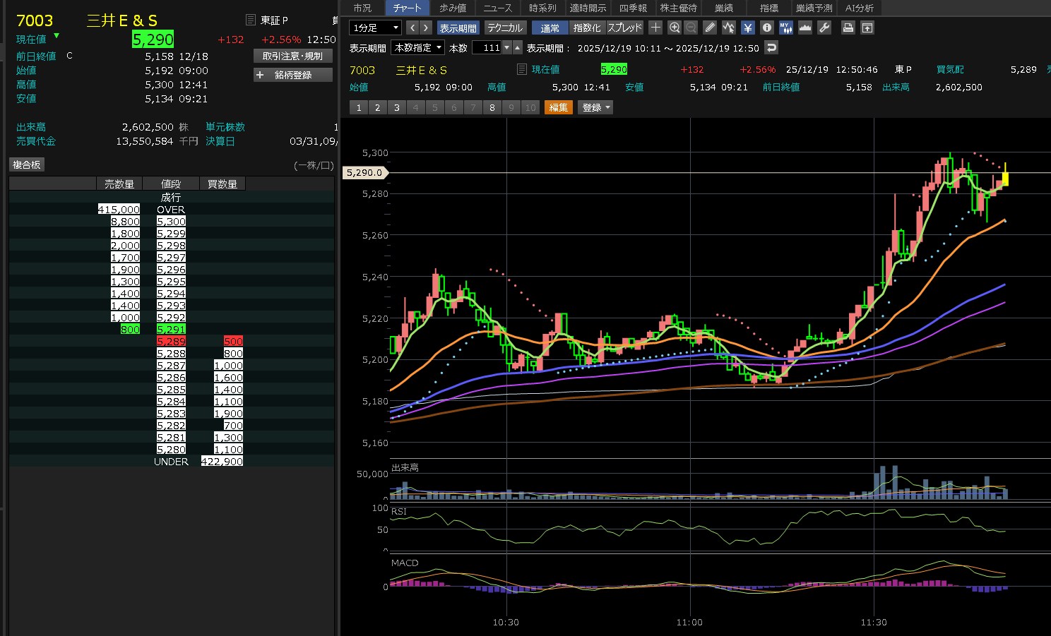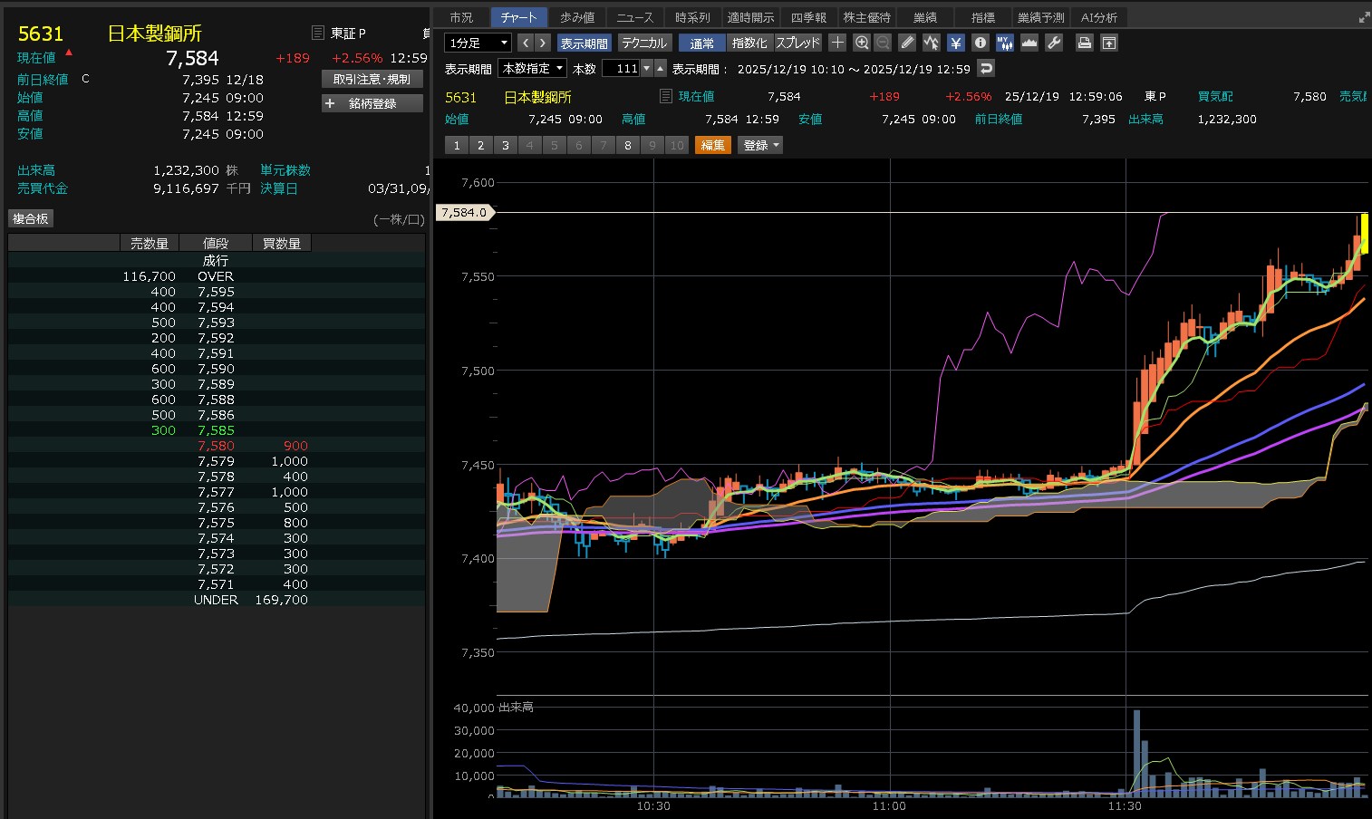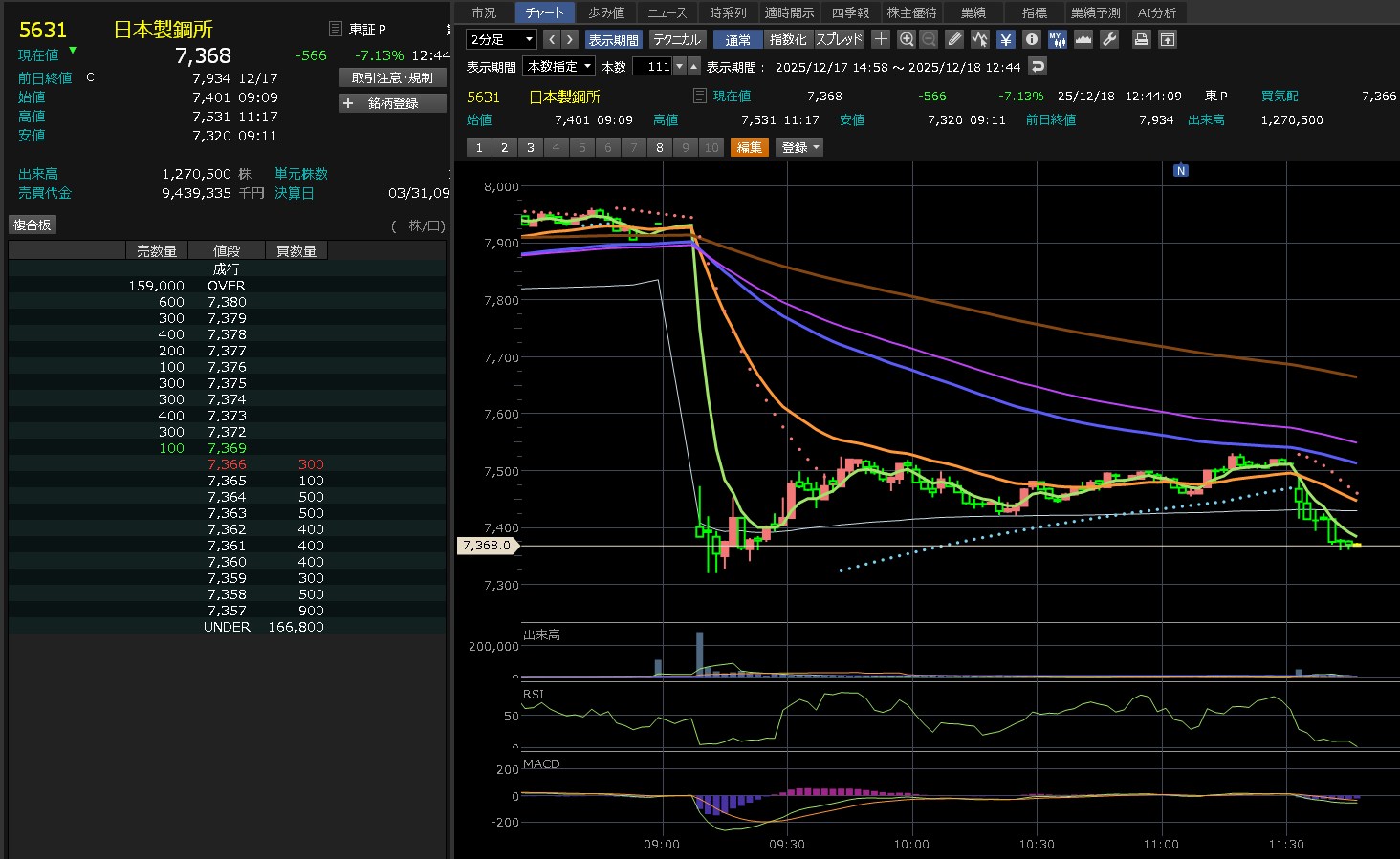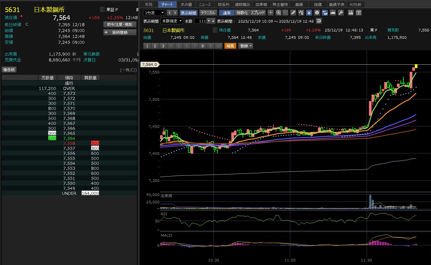 日経がずんずん上げてきたのに・・日本製鋼所は全然上げないわ。7450を超えられないな。これ・・・そして後場はズドンが来るねん。わかってんねん。だから追加購入してないねん。7450が大きな壁やなって思ってしまうぐらい弱いな。売りたいやつ多すぎ!あ、ワイもか(´・∀・`)エヘヘ それにしても売買代金がそれなりに多いねん。