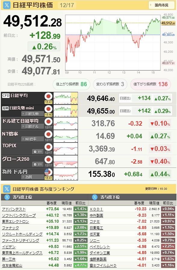 日経平均49,512.28+128.99+0.26%[15:30]米ドル/円155.33+0.62+0.4%[15:30]