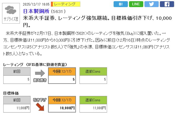 うーんこれか・・・これは厳しいな。それで下げてたんか・・・それでも「強気」ではあるんですけどね。強気でも目標株価下げられるとこうなるんか?結託してるのか?これ見たら買えないな。
