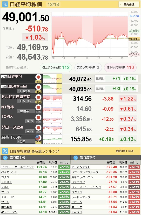 日経平均49,001.5-510.78-1.03%[15:30]米ドル/円155.86+0.19+0.12%[15:30]