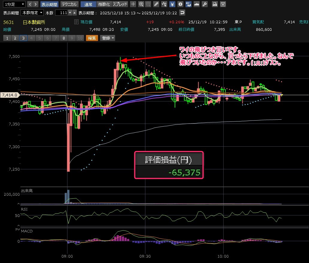 前場が始まりました。うーんなんか嫌な予感がして、買いを外しましたが、買ったままにしておけばよかったよ。上げてるし、そして買ったら下げるし・・・ホンマになんなん?って感じですわ。追加購入しようと思ったら上げていくし・・・どうしようかな。すでに含み損ですが・・・ゆっくり見ていきます。