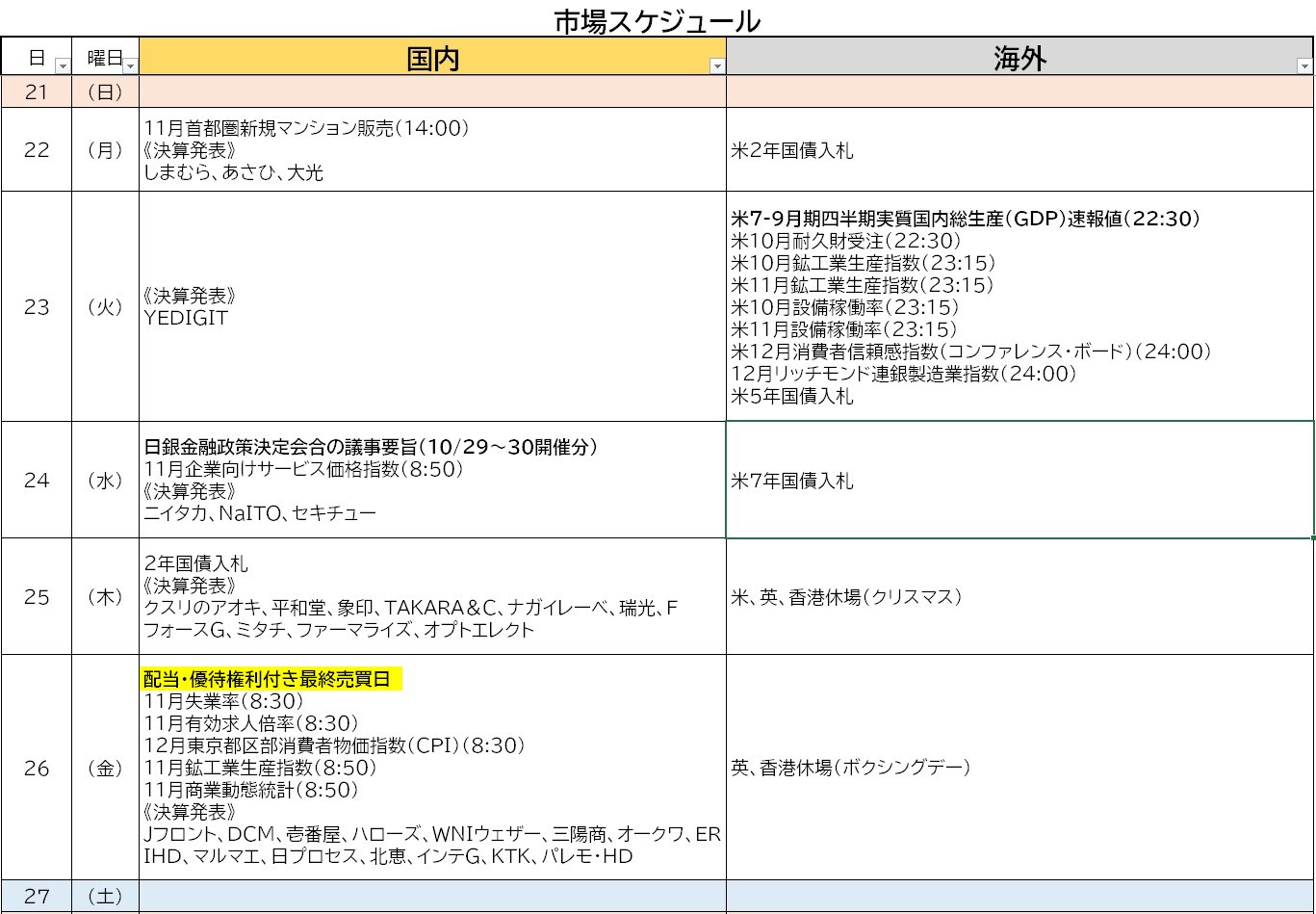 いよいよ今年もあと僅かになりました。どうやらワイは今年もマイナスです。去年の▲800万に比べればまだマシにはなりそうですが・・・何にしろ去年今年とセブンイレブン信用買いにやられましたよ。もうHNKなんて信じない。強くそう思った辰巳天井相場でした。そしてセブンイレブンなんて常識的に考えてMBOなんて無理やんって、今になってそう思いながら、今週の予定は以下の通りです。