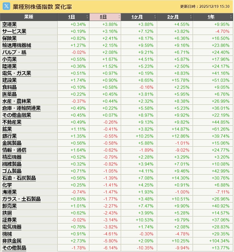 ちなみに先週の業種別騰落率は以下の通りでした。今年調子の良かったセクターがことごとく売られたのかな?知らんけど・・・ワイも日本製鋼所に40万円持っていかれたわ。クボタに15万。これを反省して次に活かすんやで!済んだことをいつまでもクヨクヨしていても仕方がない。戻ってこないですからね。って言い聞かせてる。
