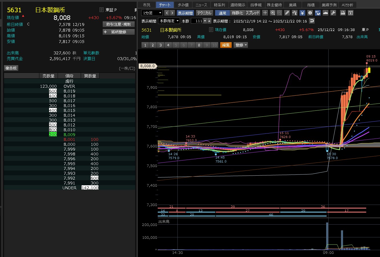今日はってかクリスマス前で商いが全くなさそうなんだが・・・日本製鋼も三菱重工に脚を引っ張られて下げそうな予感やで!今日も上げるとしたら半導体かな?でもね。ココから上値を抜いてくるにはまだまだエネルギーが足りないね。それは来年でしょう。今年はもう上がらんと思う。