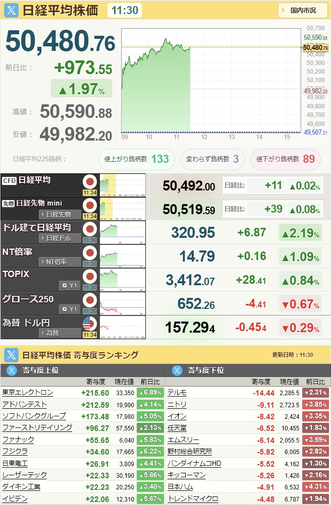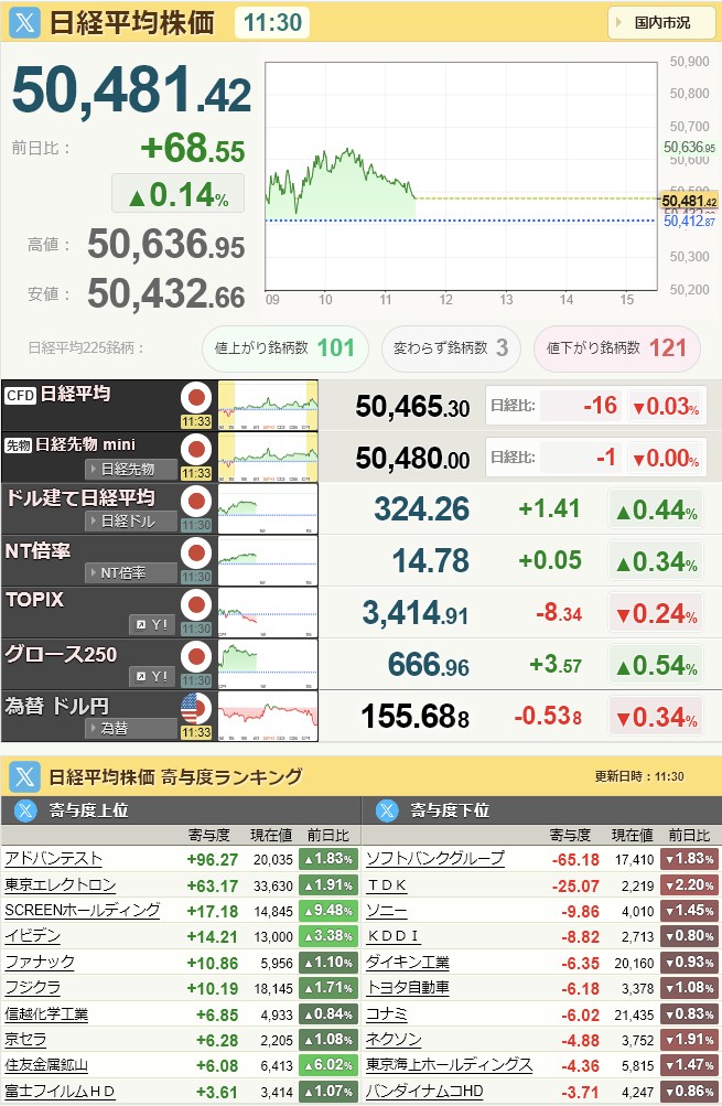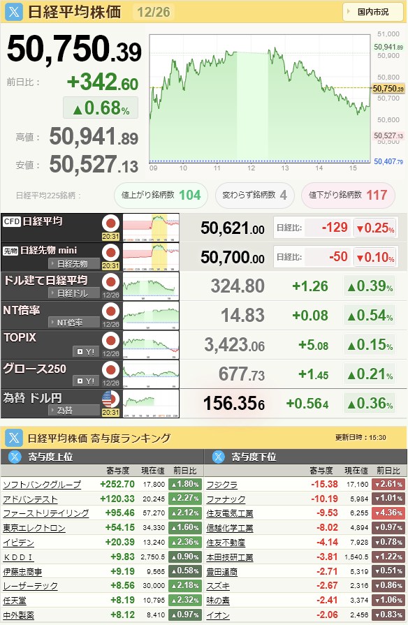 日経平均50,750.39+342.6+0.68%[15:45]米ドル/円156.520.00.0%[06:59]