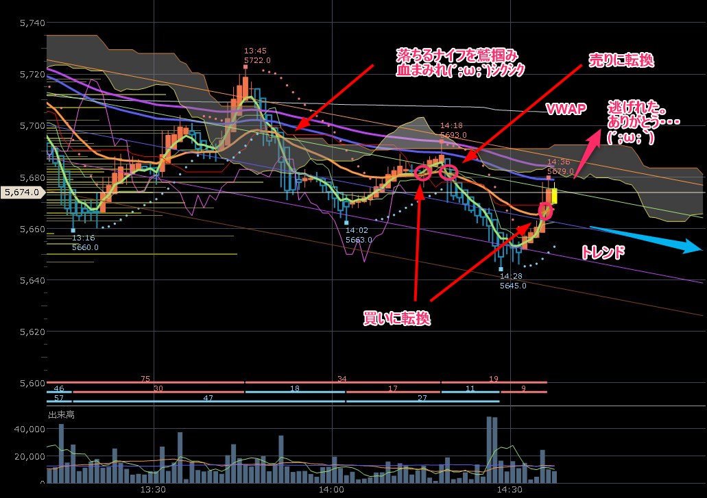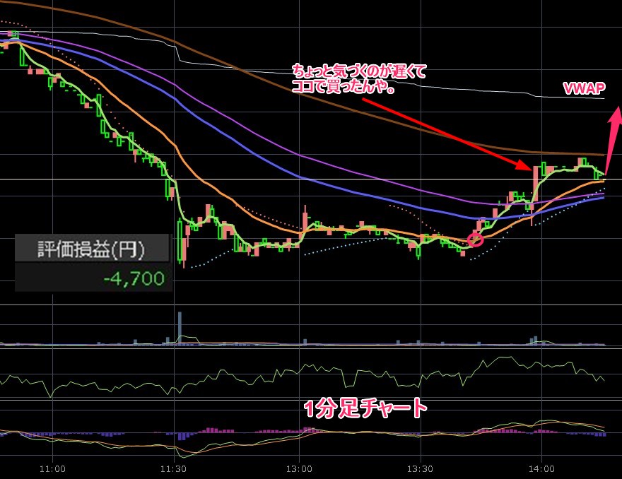 日経が買いに転換した。ココからは買いやね。こういうときにすぐ逃げてしまうワイは学習能力がないな。ワイは今日はもう疲れたわ。もうええかな。って思ったりしています。14:43