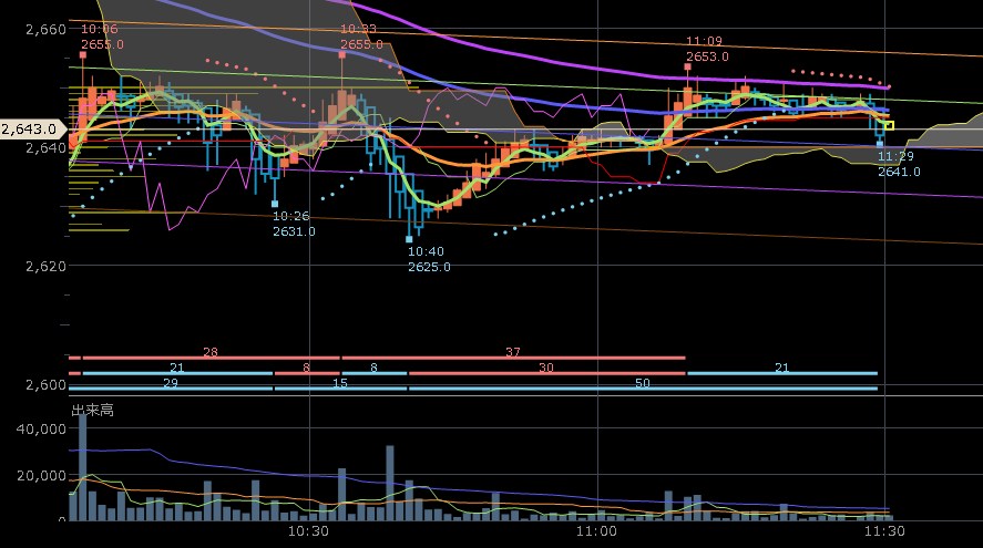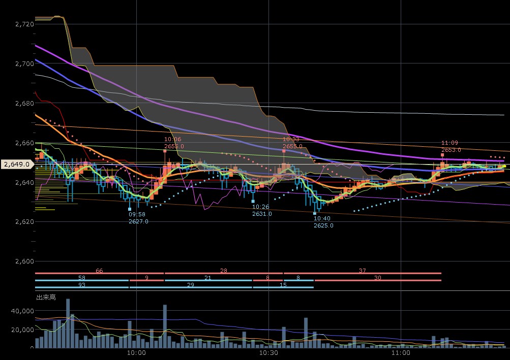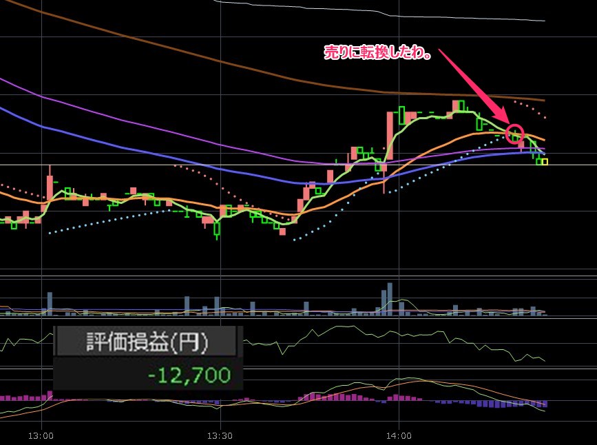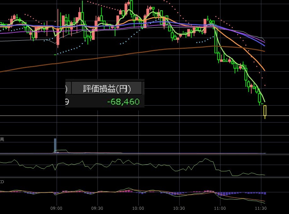 前場までに処分したいのですけどね。あ、下げてきた・・・含み損が5000になりました・・・(´;ω;`)シクシク ここからパラボリックが陽転したら、期待できるんですけどね。あと3分か・・・