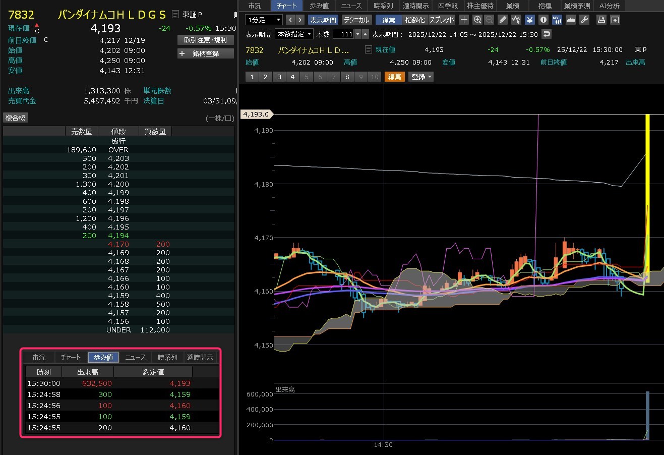 歯医者から帰ってきました。3:46です。任天堂は引けドンですね。安値引け・・・@10245で引けました。これはきつい。ワイはホンマに運が良かった・・・ワイが買っていたのはバンダイ<7832>です。引けピンでした。運良く引けピンでした。売れてました。