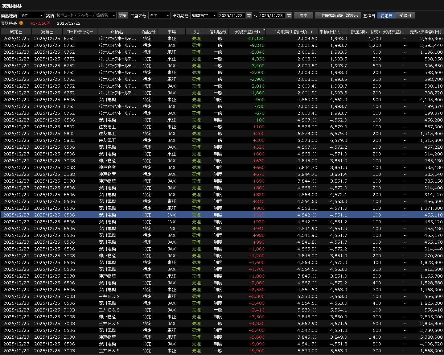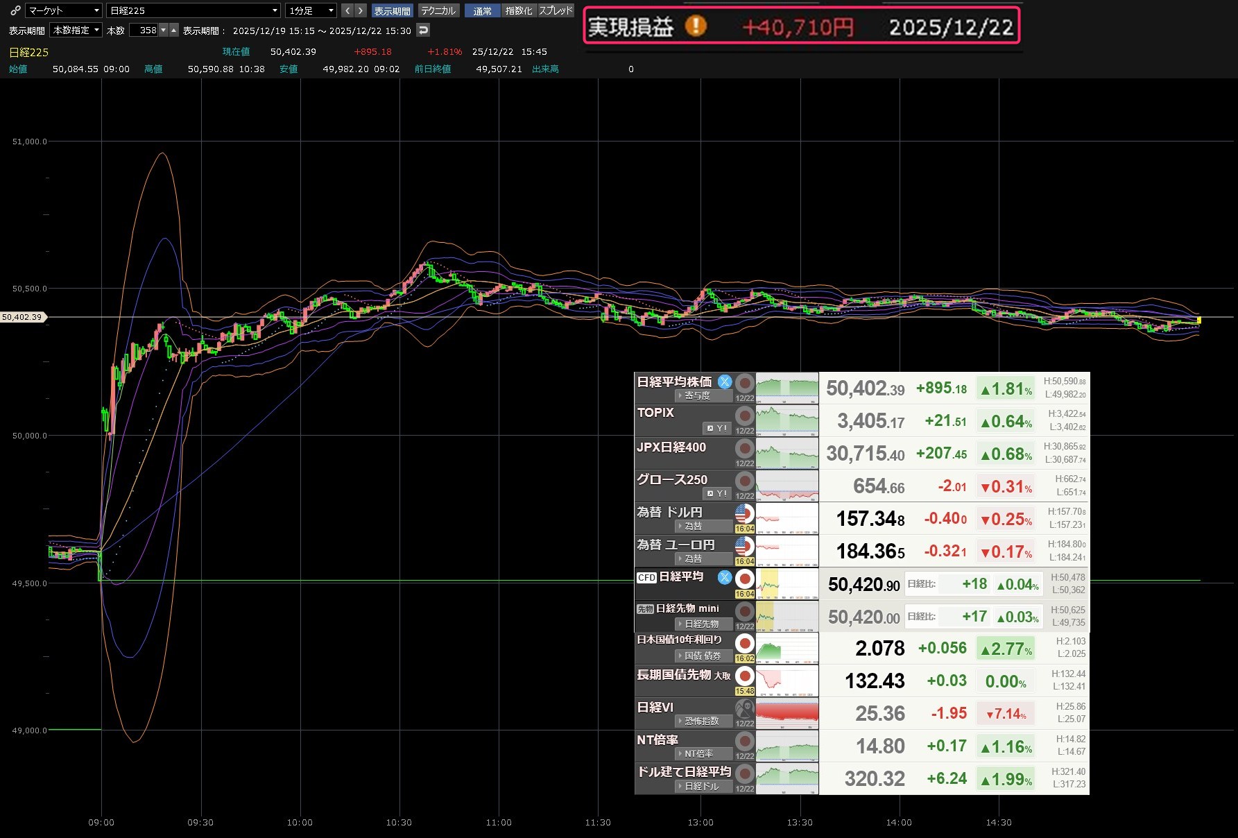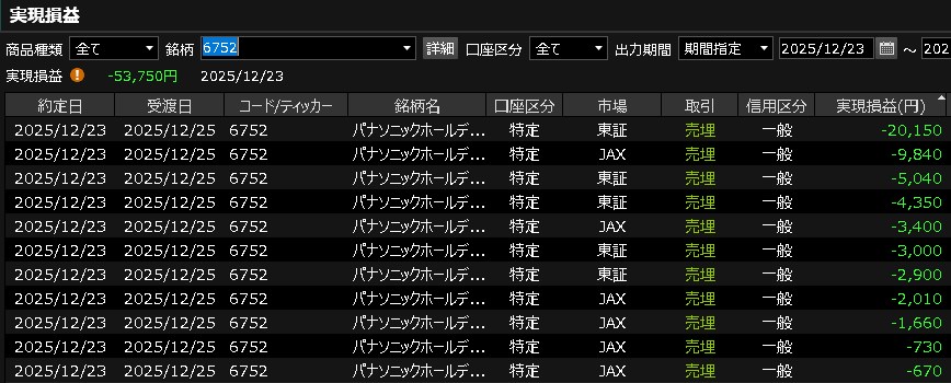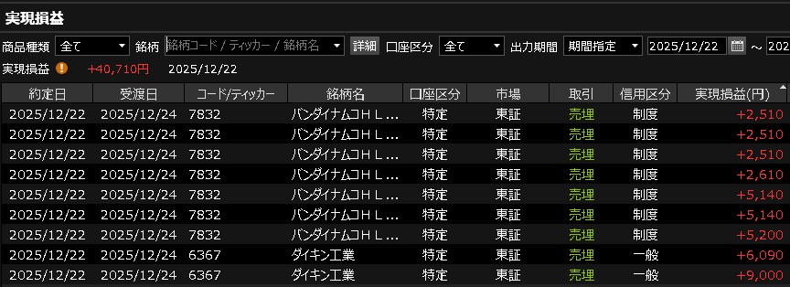 実家にミニPCを持っていっていました。相場は見ていました。前場は大上昇で、後場は落ちていきましたね。本日の結果は以下のとおりです。