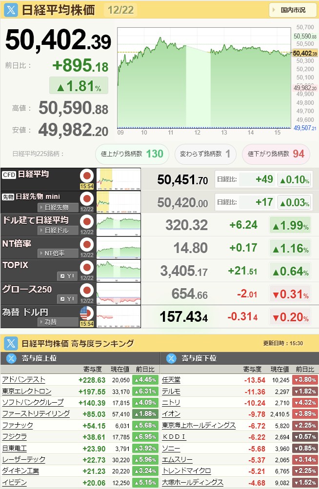 日経平均50,402.39+895.18+1.81%[15:45]米ドル/円157.35-0.4-0.25%[15:39]