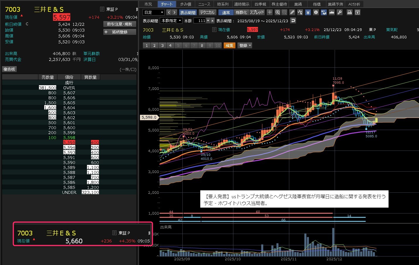 さて、三井ESですがチャート的には下落トレンドに変更なんですが、材料がトランプの黄金艦隊ですからね。このまま沈むとは思えないんや。ただ、チャートは下落転換なんですけどね。