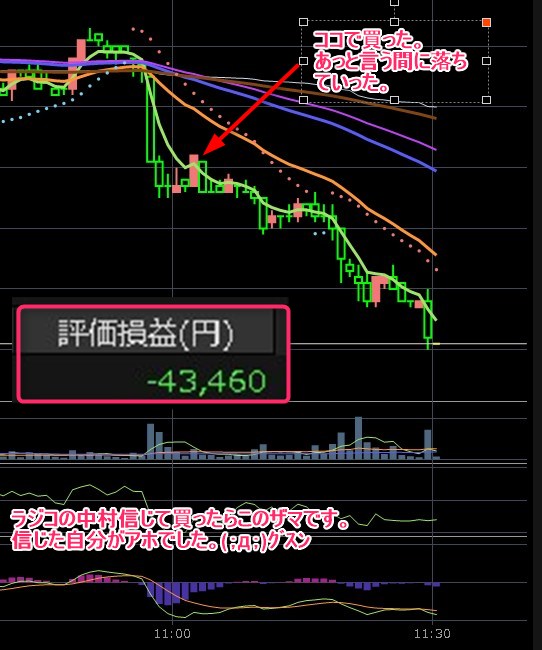 後場が始まりました。ちょっと下げすぎやろってことでかってみました。以下の銘柄ではないよ・・・これ下降トレンドやね。今入ったらアカンわ。リーマンタイムが終わるまでは様子見が吉やね。これは下げやわ。リーマンが売ってきてるわ。