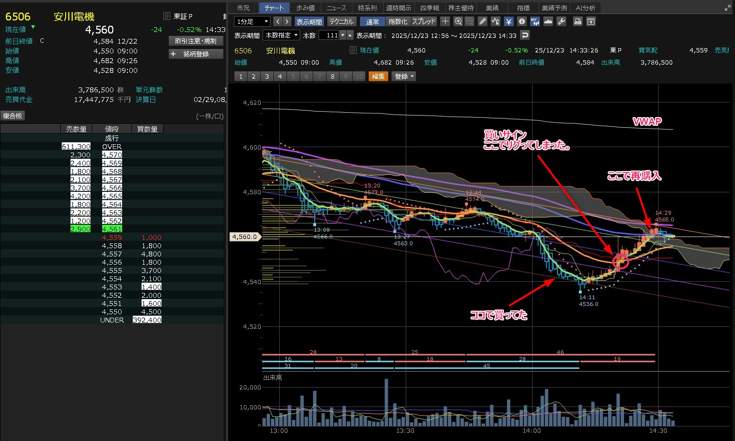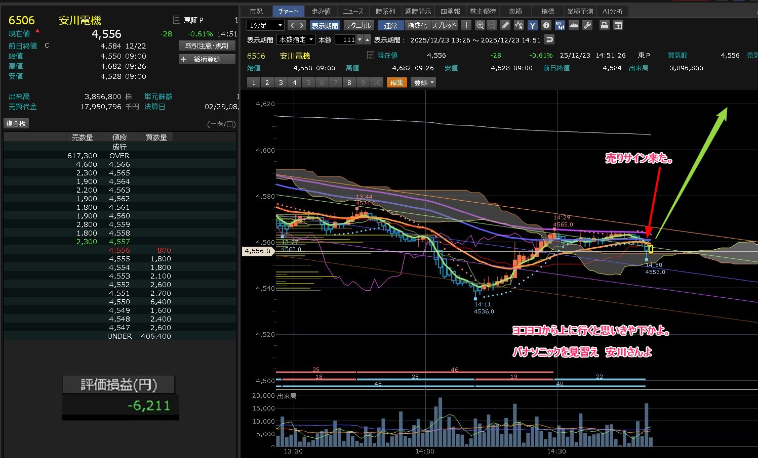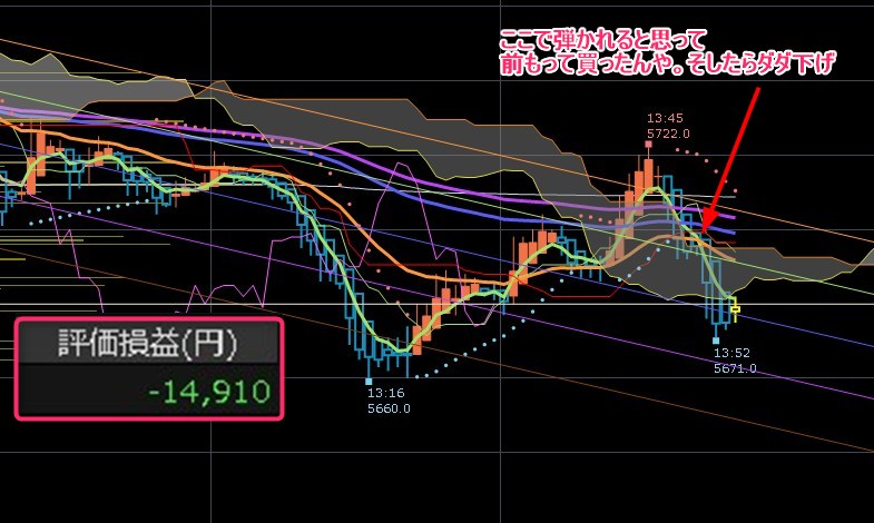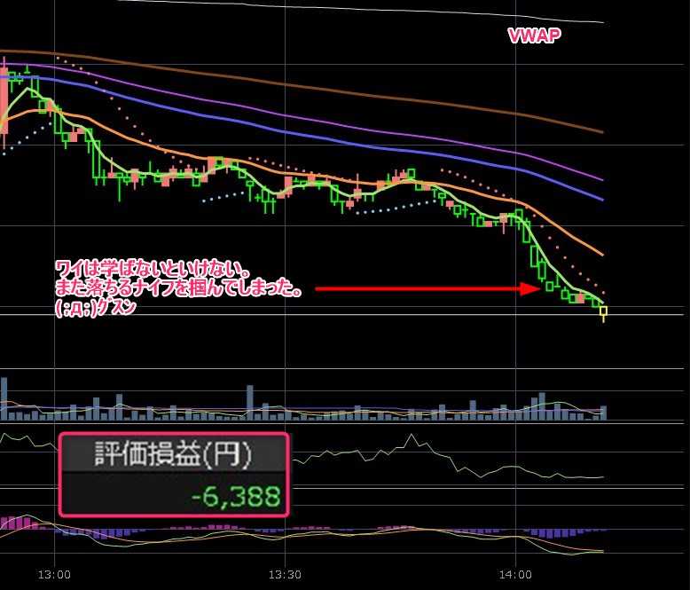 買いに転換したけれど、このサインだけでは心もとない。日経がぐんぐん下げる。ただ、ワイの株は粘ってる。現在含み損は▲16000や。頑張れ・・・なんだかね・・・追加購入できなかったんや。また売りに転換した。含み損が増えた。