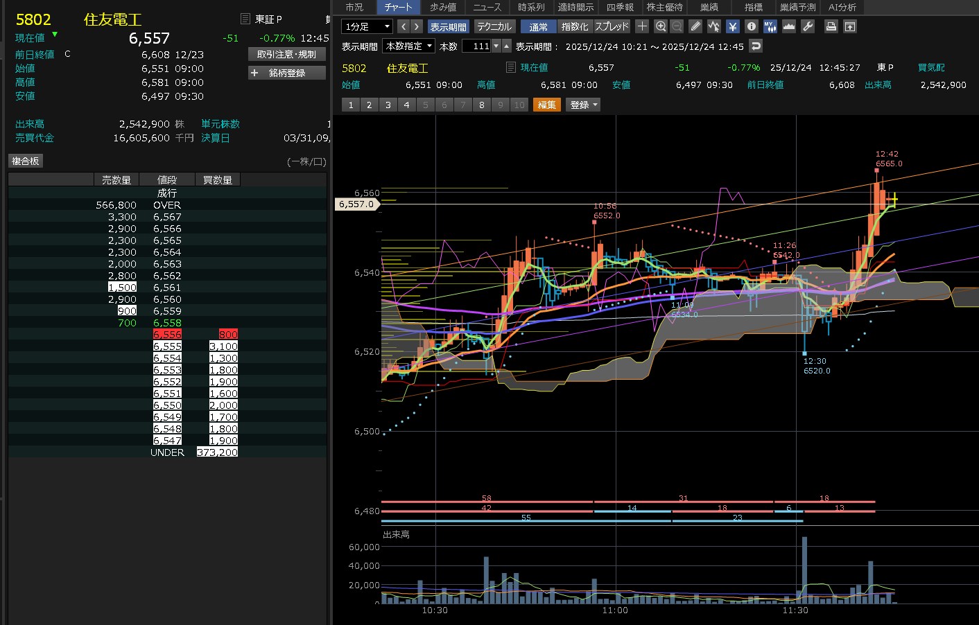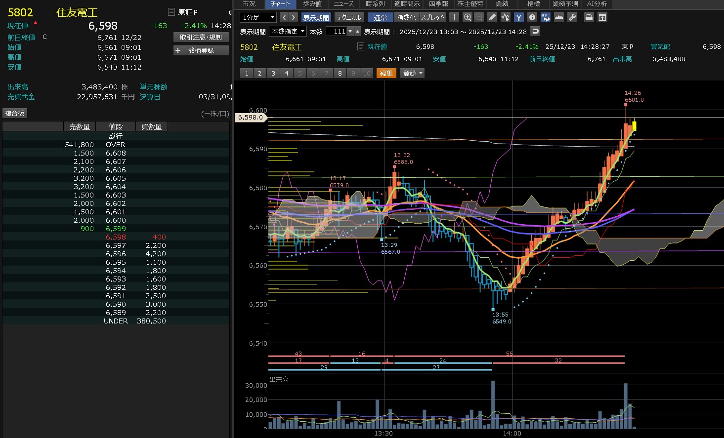 住友電工・・買いかなと想っていた時期が私にもありました・・・下げとるやんけ。引けにかけて売買活況になってきた。入りたくなるけど後悔しそうなのでやりません。今日もあと10分です。