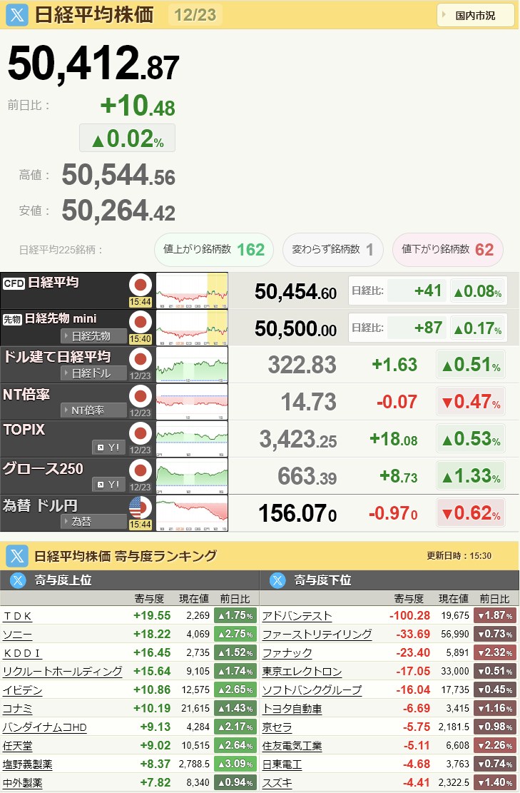 日経平均50,412.87+10.48+0.02%[15:30]米ドル/円156.13-0.92-0.59%[15:40]