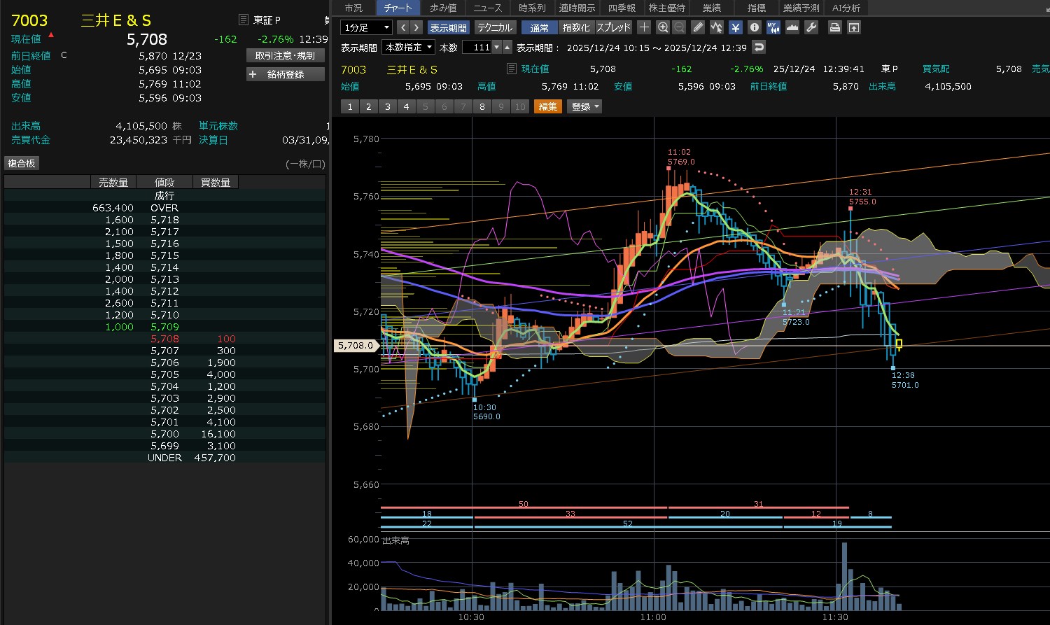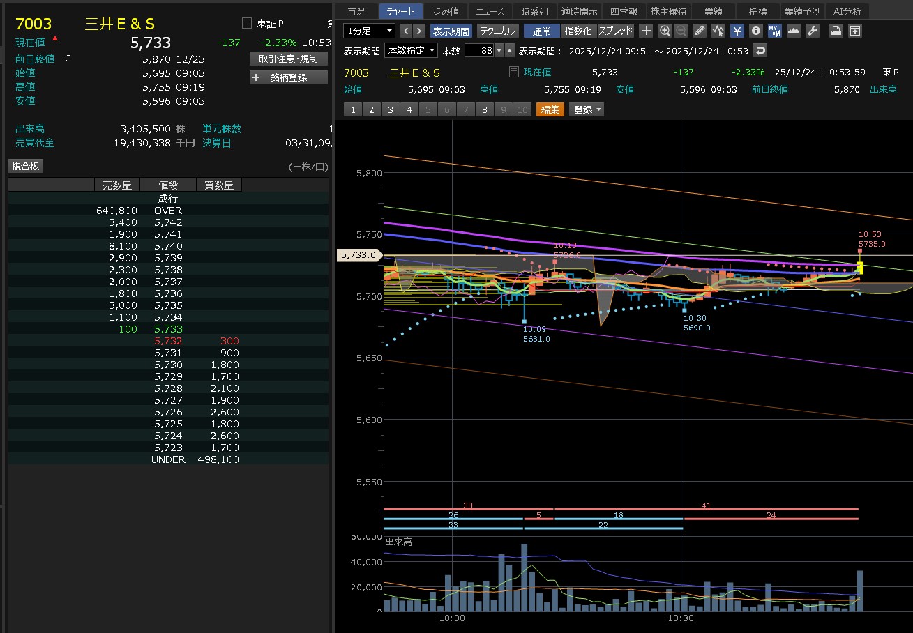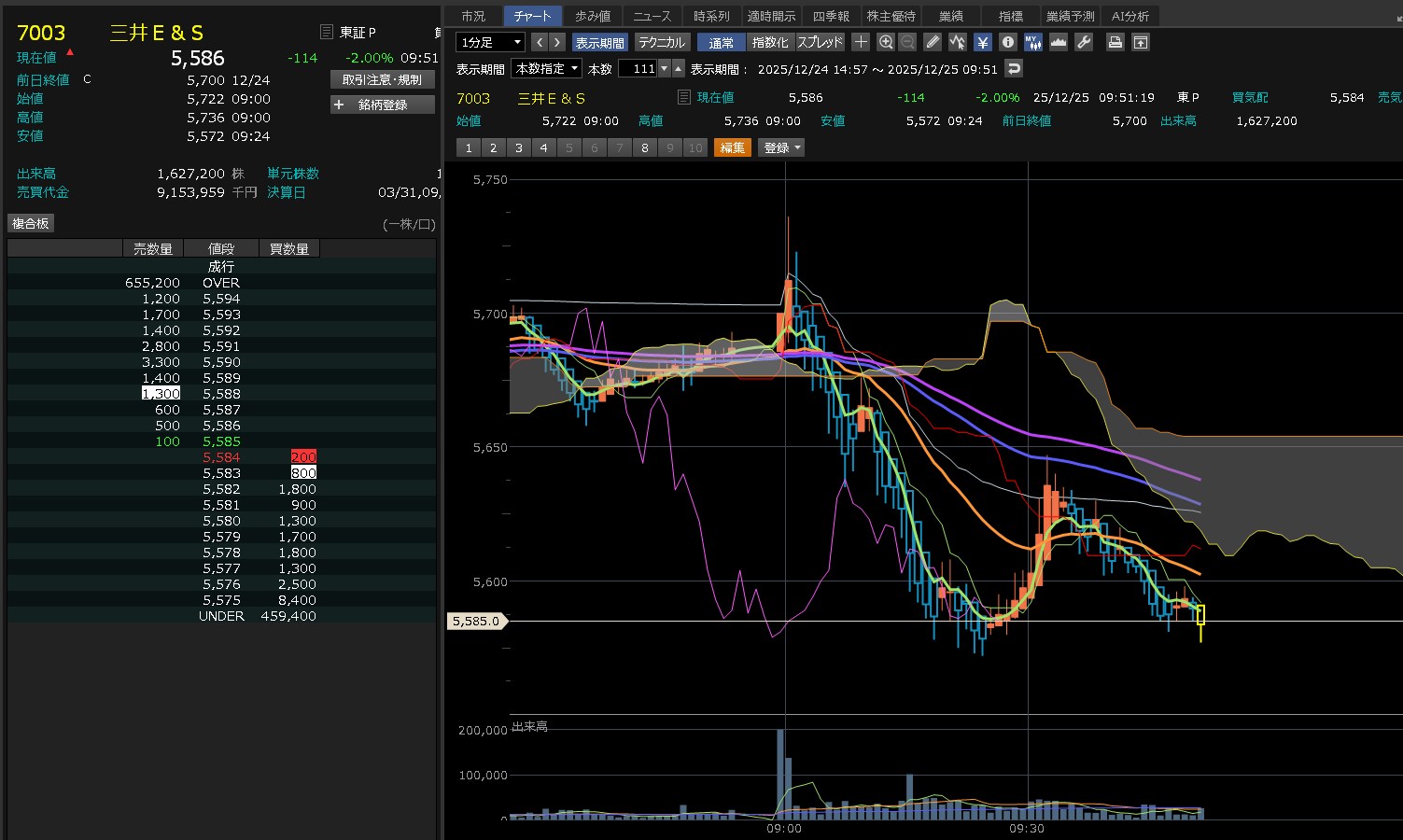 さて、あと10分で前場が終わります。参考として三井ESのチャートを貼り付けておくで!これ下手したら下降トレンドになるかもしれん。押し目なのかも知れないが、線がクロスしてるね。要チェックやで!