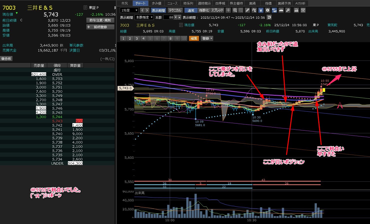 三井ESは良く下げてるけど・・・もう入れない。下げすぎてるけど入れない。弱いチャートになってる。下げてもそこからヨコヨコにならないとようは入れない。13:20