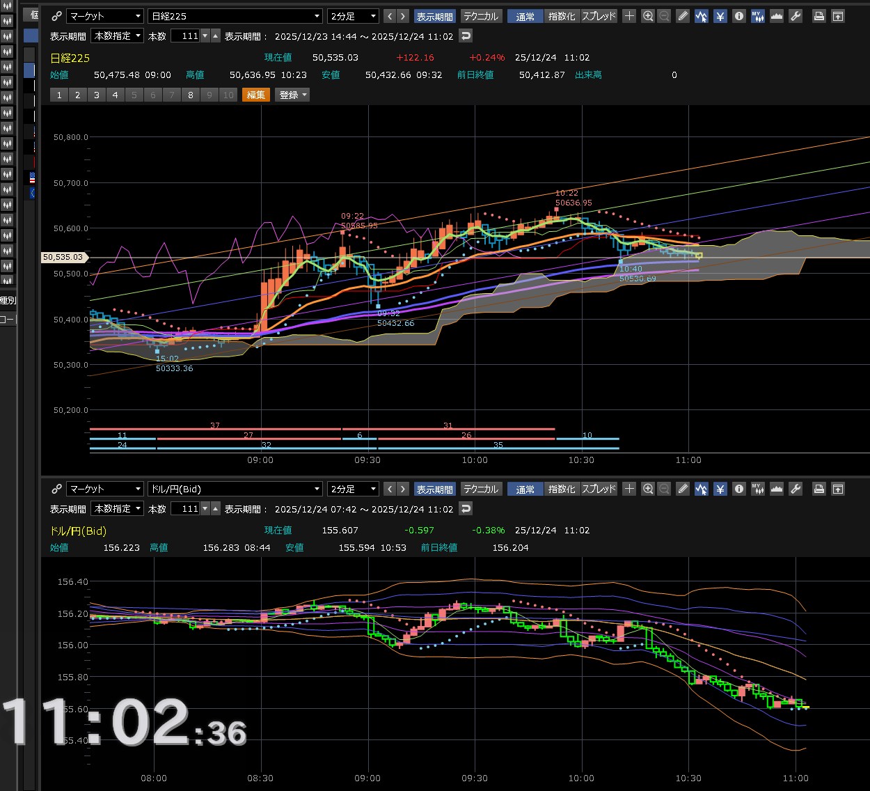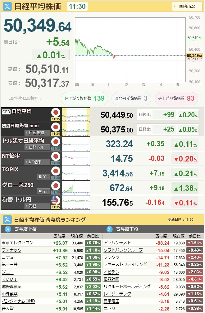 日経平均50,407.79+63.69+0.13%[15:45]米ドル/円155.86-0.03-0.02%[15:39]