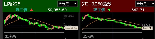 TOPIXはマイ転。日経はプラマイ0 グロースはプラスなんですよね。これをどう読み解くかですね。13:21