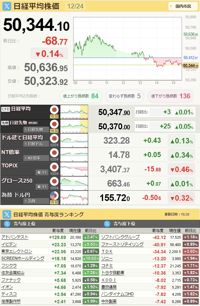 日経平均50,344.1-68.77-0.14%[15:30]米ドル/円155.73-0.48-0.31%[15:30]