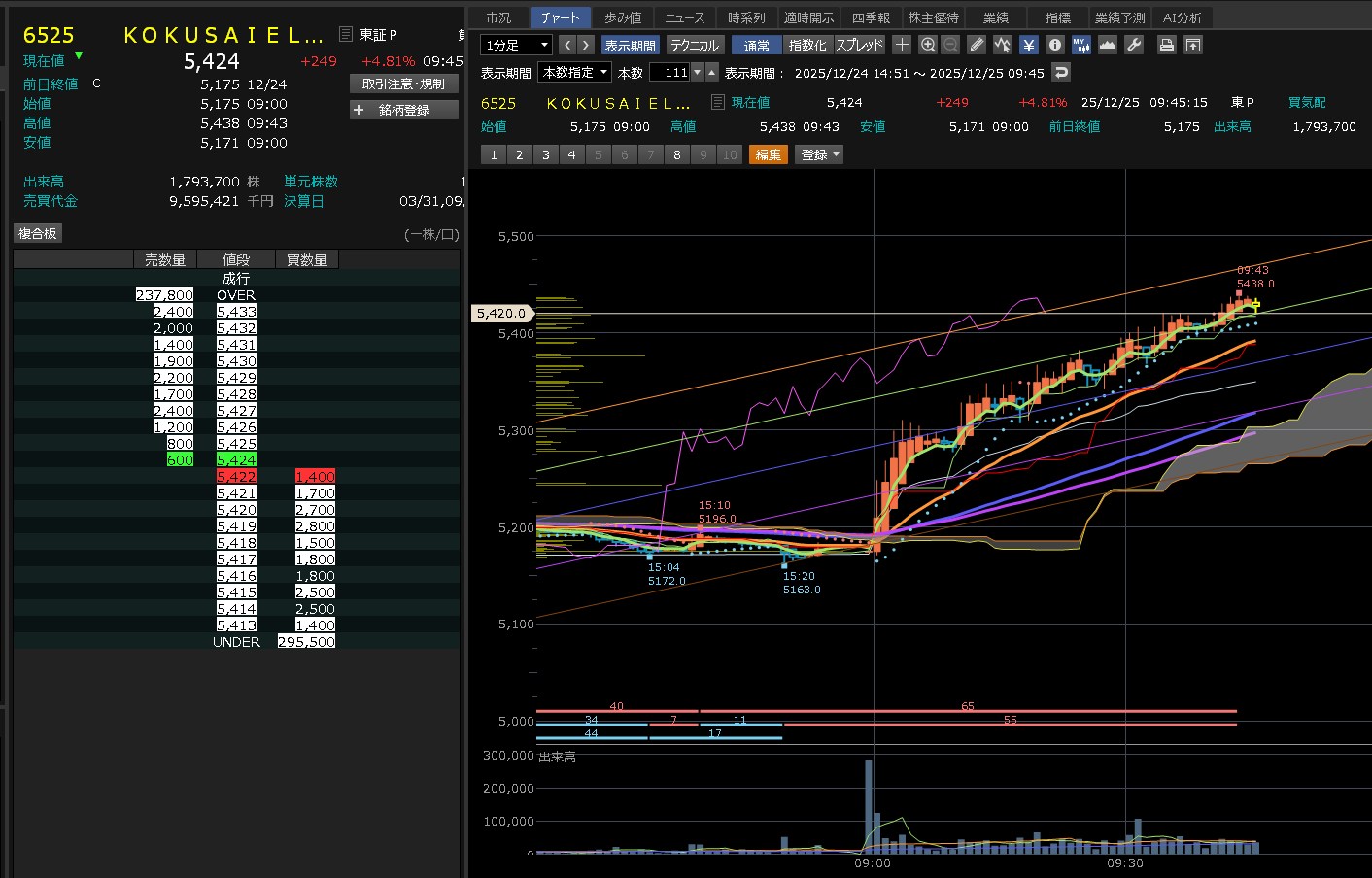 今日はもうええかなって感じがしてきました。実は日本製鋼所を買って僅かですが抜いたんやで!1万円もいかない利食いです。そして実は前場に目をつけていた銘柄がKOKUSAIやったんや。もう手遅れや・・・5200は絶対超えると思ってたんや。もうええわ。くやしー