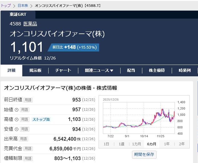 それでも勝てたのは偉いよね。しかも下げてる銘柄でね。後半はほとんど一円抜きです。にしても引けピンやったから、最後デイトレしても良かったかなって思ってます。これで今年受け渡しの取引は終了ですね。引け間際に優待銘柄を購入して終わりです。PTS見てると大幅安で泣きそうですが仕方がない。あとな逃げに昨日ラジコにでていたオンコリスバイオファーマの社長のインタビューが良かったのですが、実際寄り底でぐんぐん上げてたんですね。知らんかった・・・