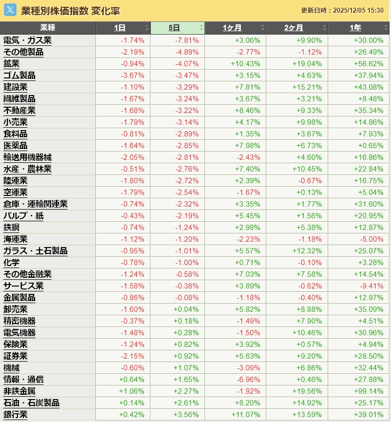 戦争はよくないよ。よくないけれど、攻めてくる国があるから守りを固めないと仕方がない。ウクライナが核を廃棄したら速攻でロシアが攻めてきたからね。これを見たら、日本も軍事力を高めないといけない。スパイに寄って骨抜きにされている今の国を見ているとスパイ防止法と国防を早急に対策しないといけないですね。立憲、共産、れいわ、社民は無いわ。なんて思いながら、先週の業種別騰落率は以下の通りでした。