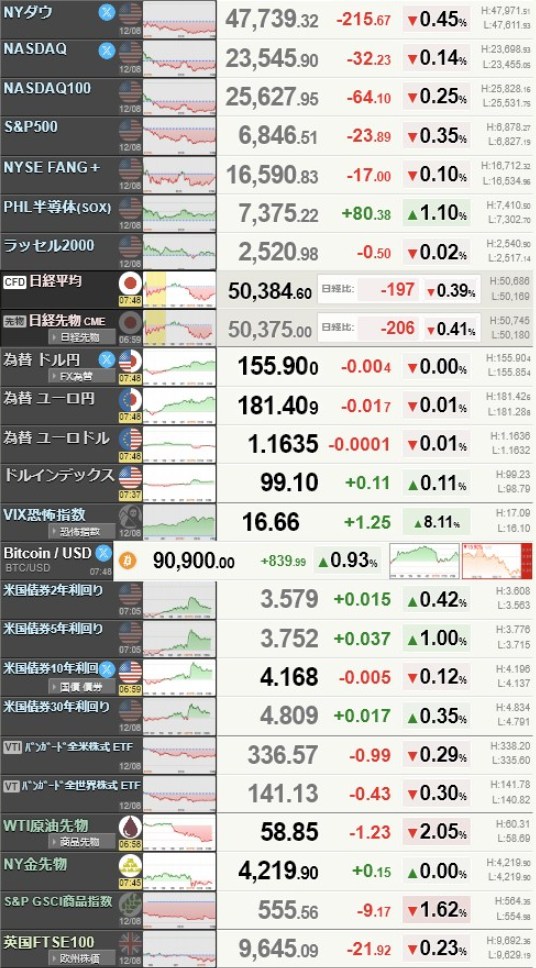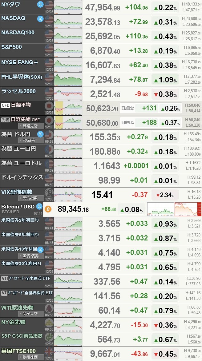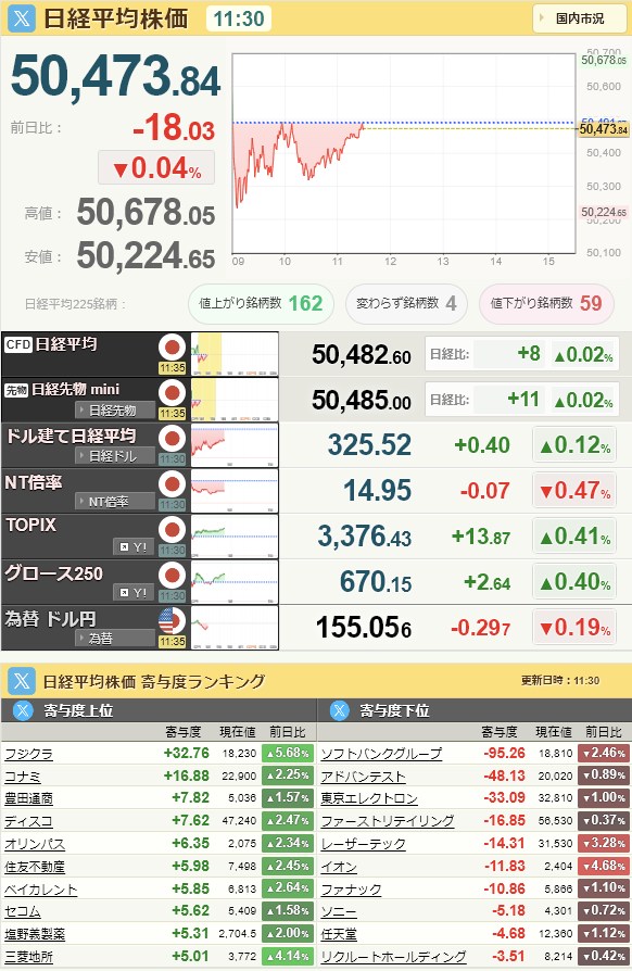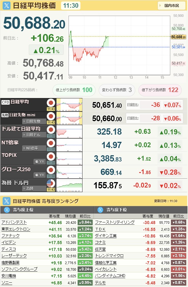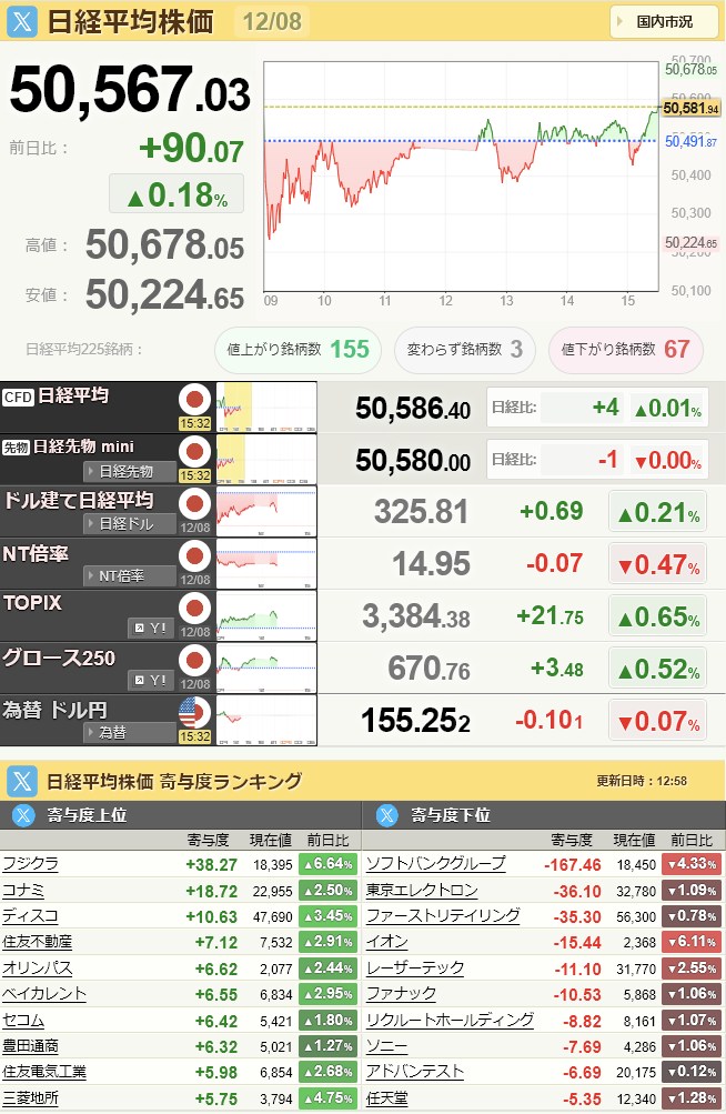 日経平均50,581.94+90.07+0.18%[15:30]米ドル/円155.17-0.12-0.08%[15:40]