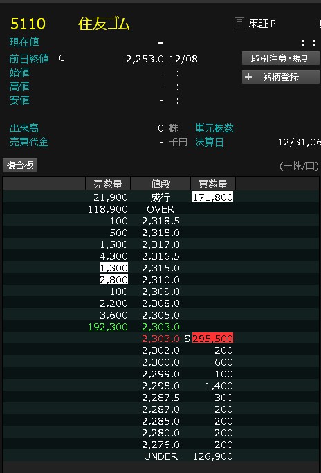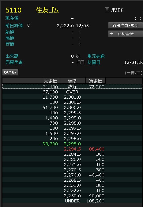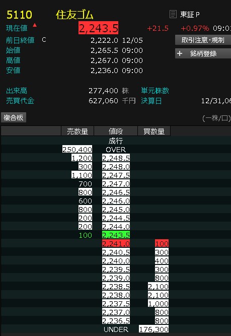 いま住友ゴムの気配を見るとなんか・・・ええやん・・・先物上げて返ってきたと言ってもこの気配は無いわ。これやったらロスカットしたわいがアホみたいやん。まぁ寄り付き1分前で下げてくるとは思うけれど・・ワイは@2255やったから、これ以上で寄り付くのであればかなりショックやで!まぁでも仕方がないね。それが相場や。