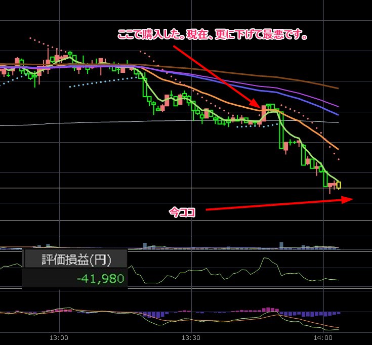 買い物から返ってきました。そしてすぐにとある銘柄を買うといきなりズドン・・・そんな気はしてた・・・本当にそんな気はしてた。ただ、ココから頑張れや。追加購入は現在怖くてできない・・・そんな下げです。