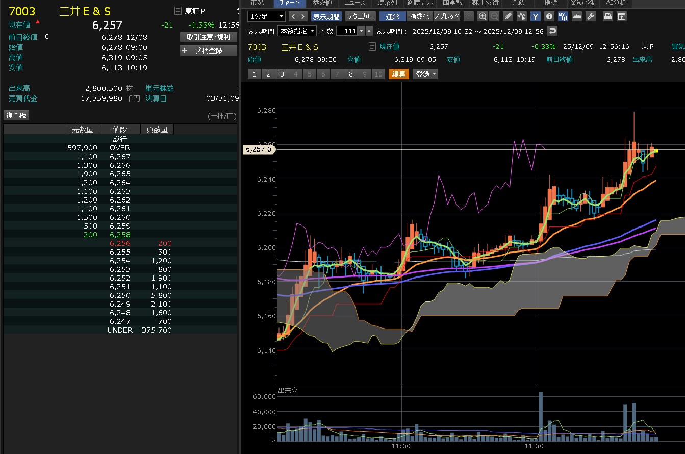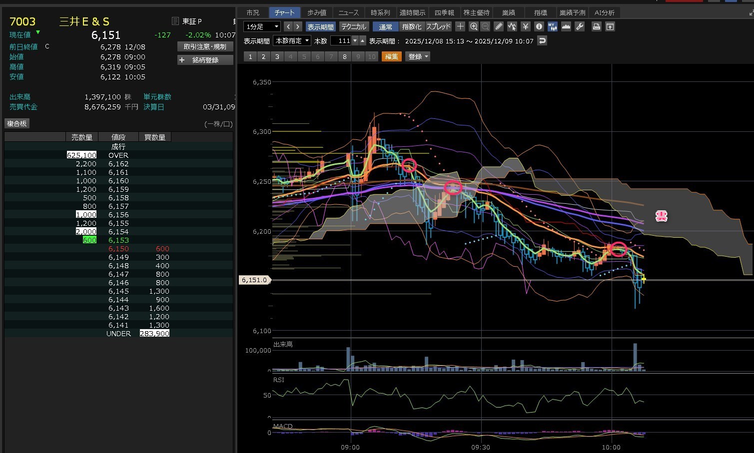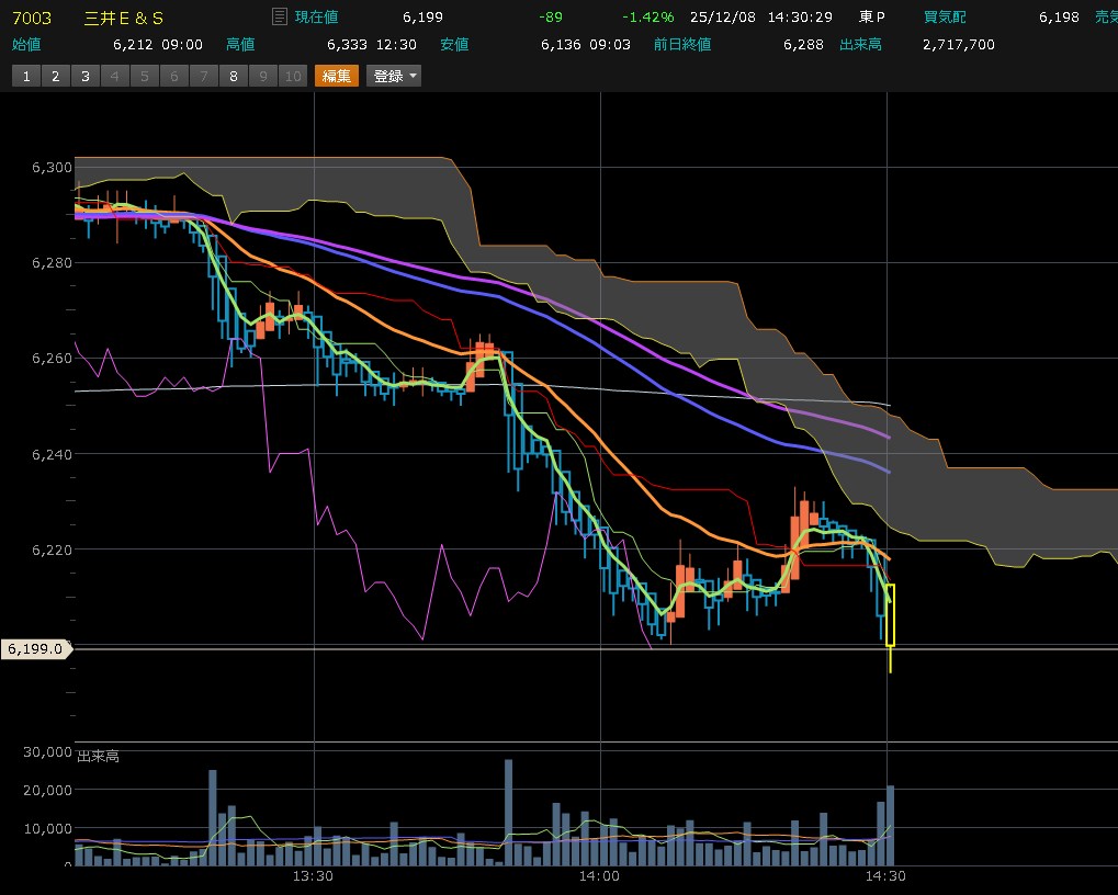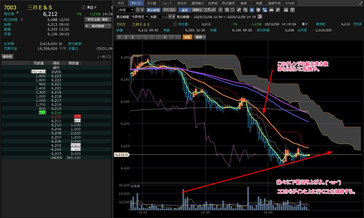 軍事関連強いね。造船も軍事関連ですよね。ワイが買ったのは造船株なんやで!実は三井ESを買ってたんや。ここも今日はプラテンになってもおかしくないと思うんやけどな。下に加速してるわ。この値動きは機関が売っているパターンやで!今は弱いターンや。だからココで追加購入はまさに落ちるナイフなんよ。