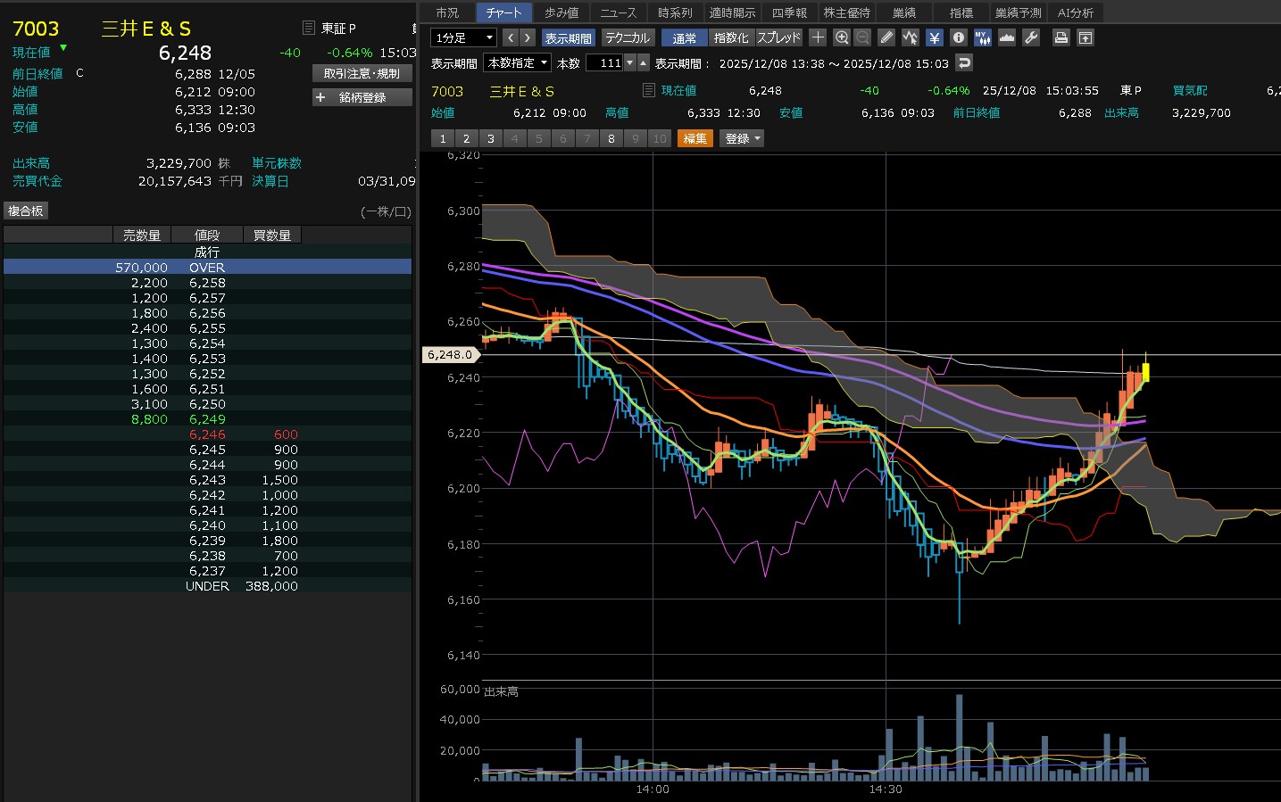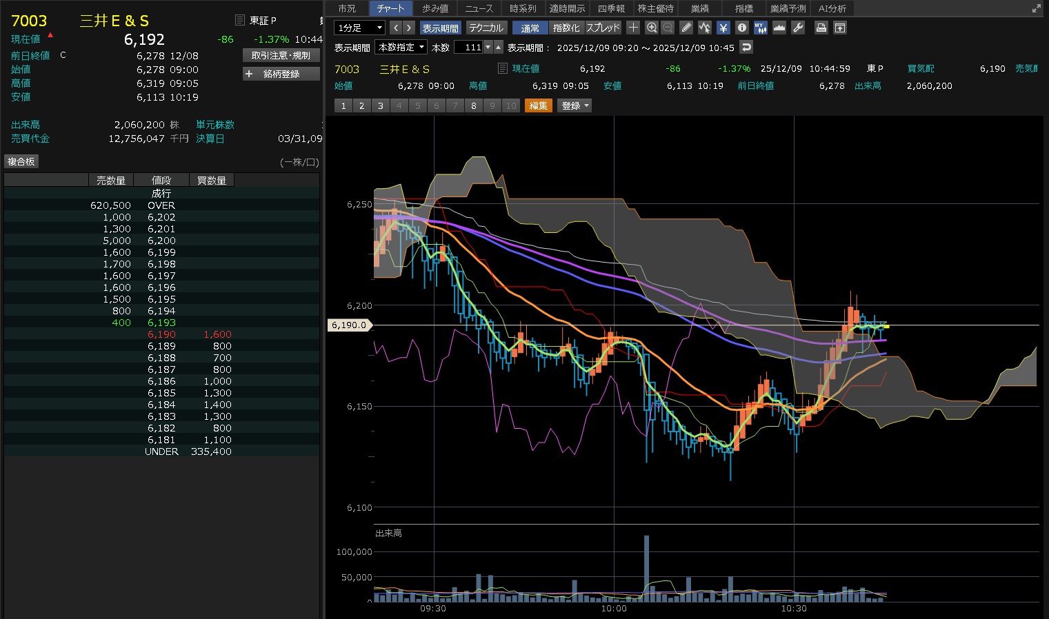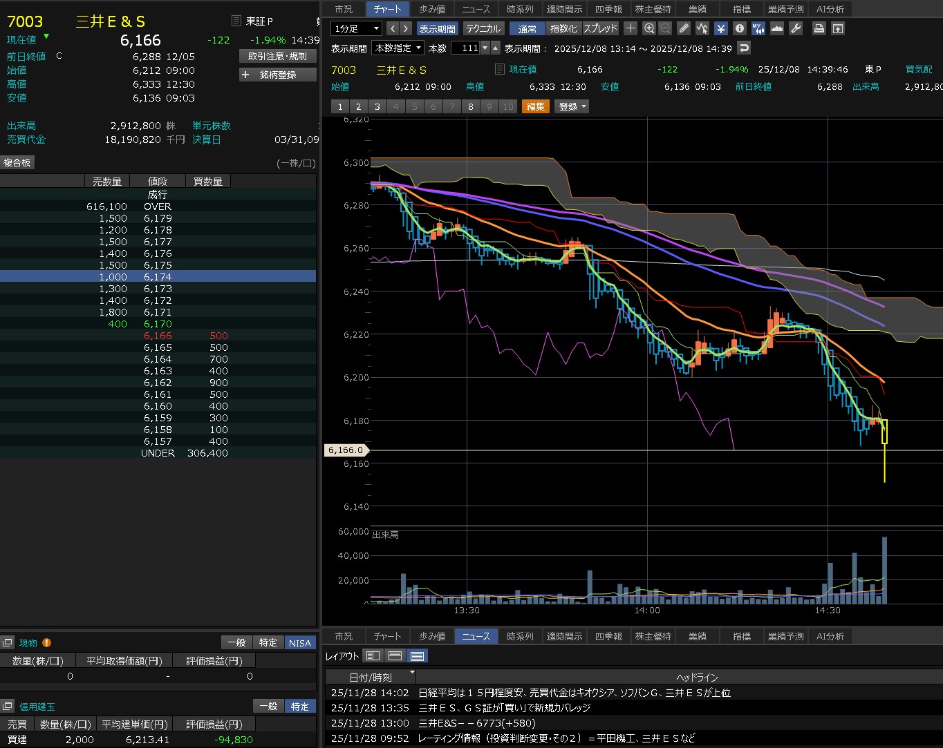 軍事関連強いね。造船も軍事関連ですよね。ワイが買ったのは造船株なんやで!実は三井ESを買ってたんや。ここも今日はプラテンになってもおかしくないと思うんやけどな。下に加速してるわ。この値動きは機関が売っているパターンやで!今は弱いターンや。だからココで追加購入はまさに落ちるナイフなんよ。