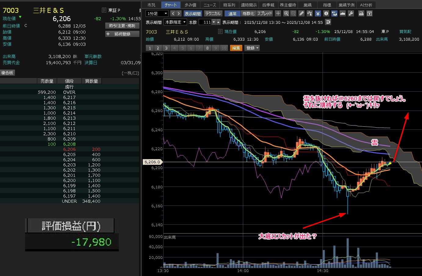 あ、闇鍋タイムになった。何も買ってないよ。三井ESは引けまで引っ張っても良かったな。ホンマに・・・ほぼトントンで逃げたのは失敗ヤッタ・・・ワイいっつも入るの早くて、逃げたいという気持ちで処分してしまうから儲けが少ないねん。これ大いに反省やわ。|柱|ヽ(´・_`・。)反省…