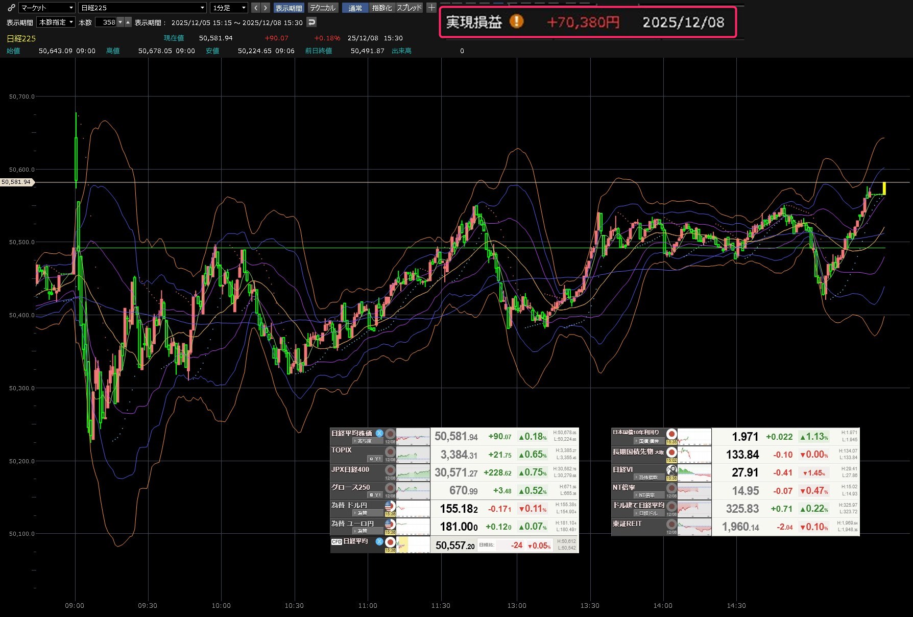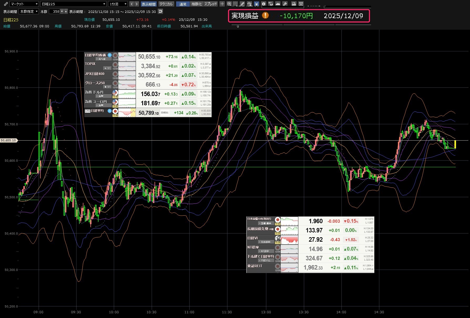 本日のデイトレ結果と日経平均の1分足は以下のとおりです。