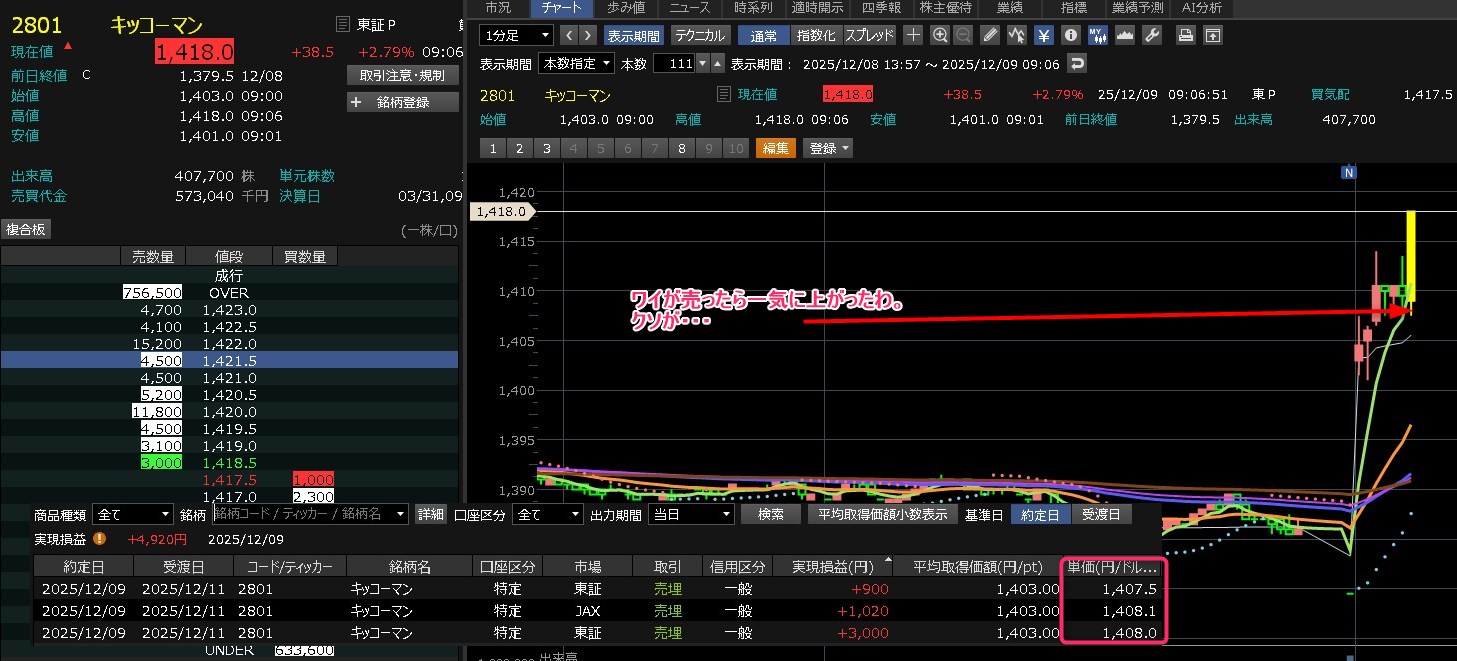 ここまで上げるなんてね。ワイは悔しくもなんとも無い。なぜなら、ここまであげる前に処分してる自信がある。キッコーマンは後場寄り付きに追加購入やね。この値動きは開始3分はズドンと下げるはずや。なので午前は暇に過ごすで!
