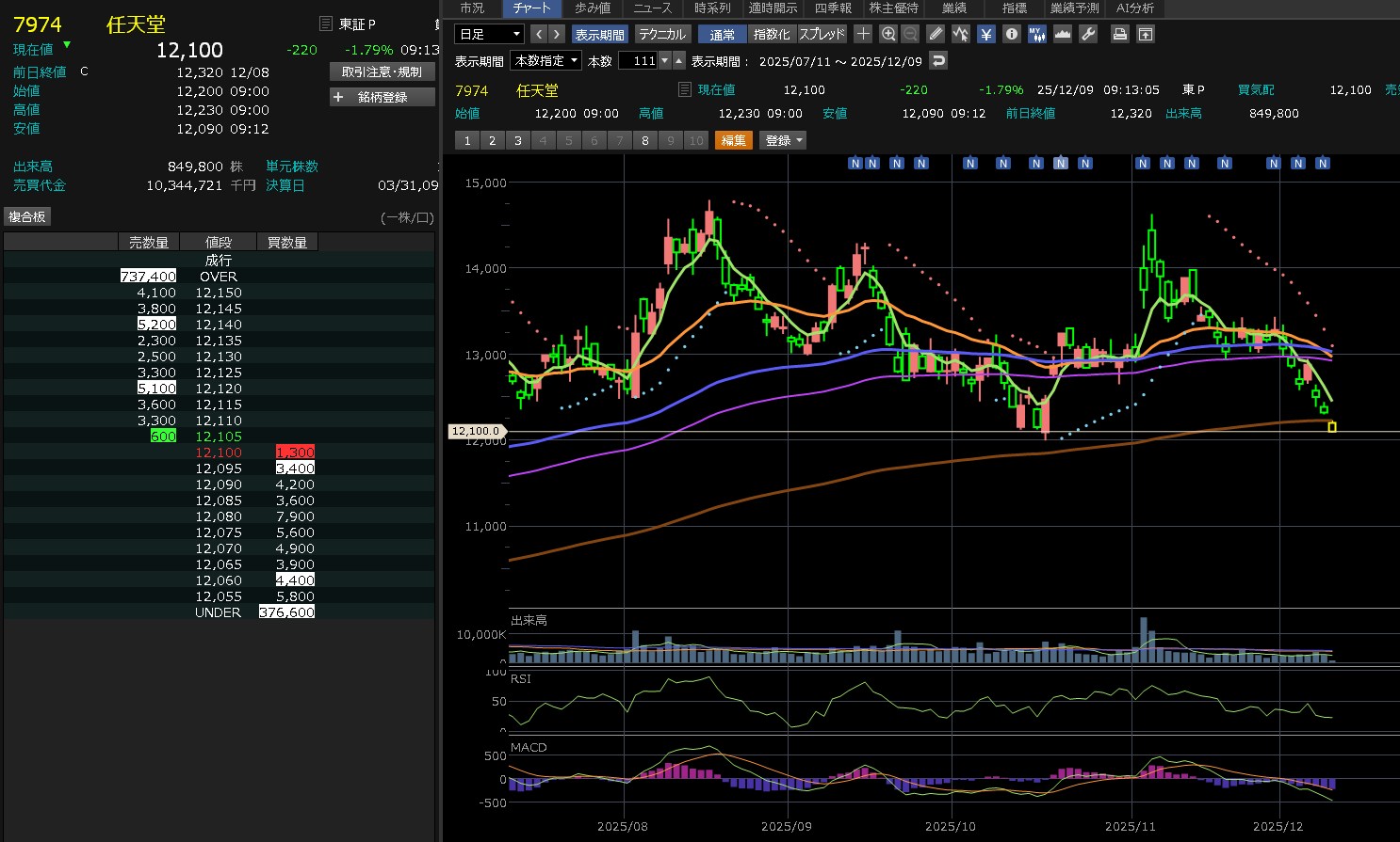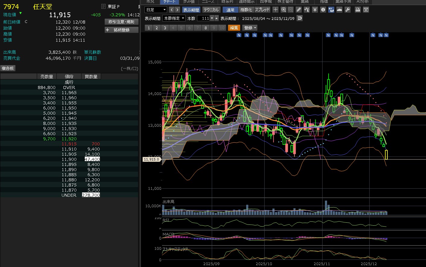 後場が始まりました。ぶっちゃけ余力があるからなにか買おうかなって考えたりしています。それにしても任天堂ひどいな。一旦、12000割り込みそうな予感がします。こういう厚い板は一度突き抜けるんやで!何度も見てきた。アルゴっちゅうやつや。