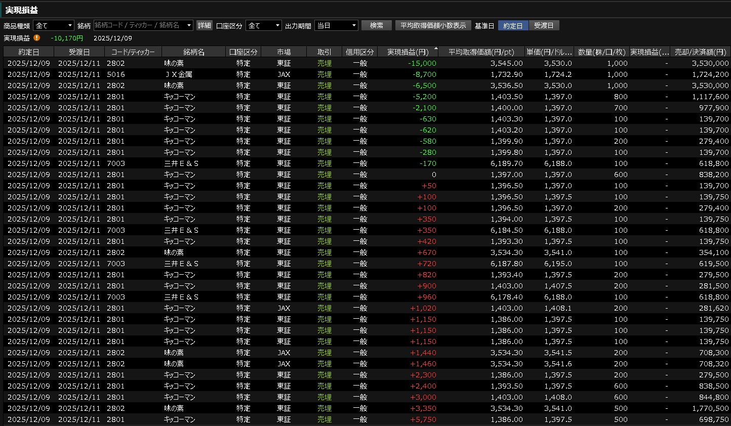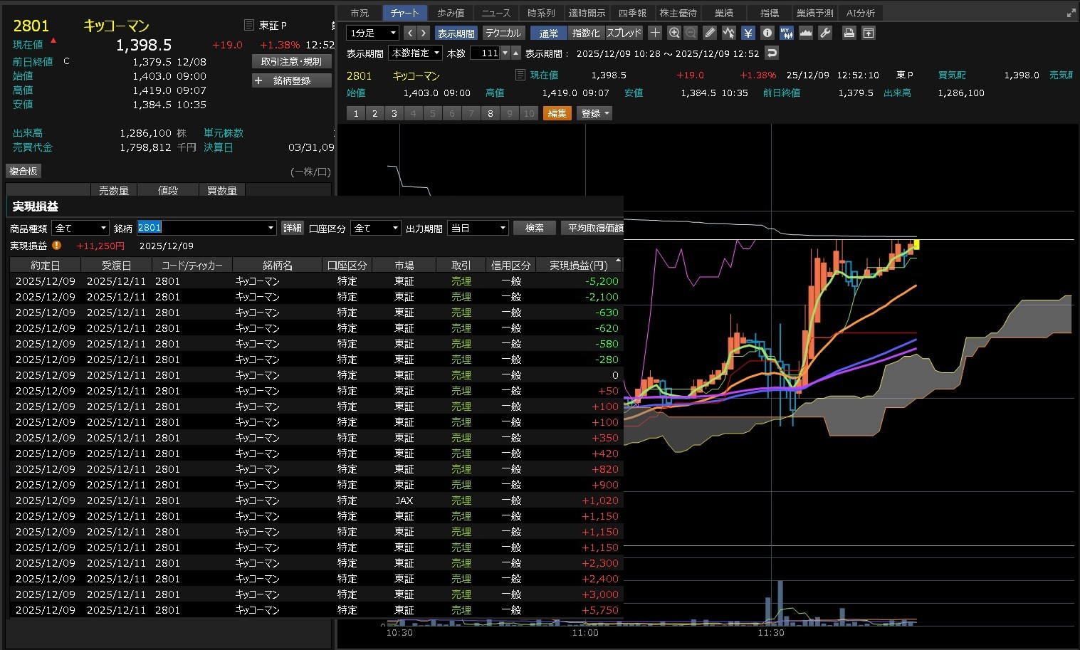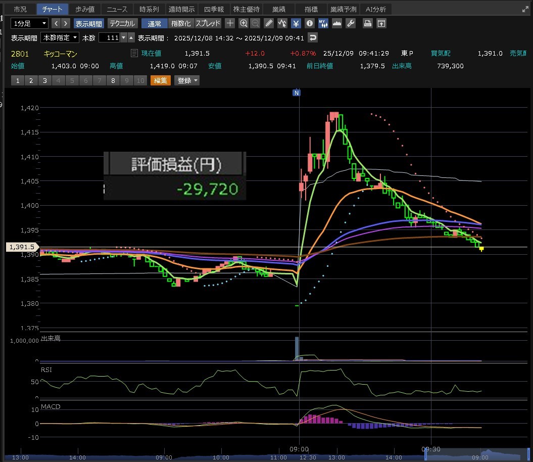 本日のデイトレ結果と日経平均の1分足は以下のとおりです。 なんかキッコーマンはちんたらして自分に合わなかったわ。こういうのはよくない。売買代金を見て取引しないと・・・って思いました。