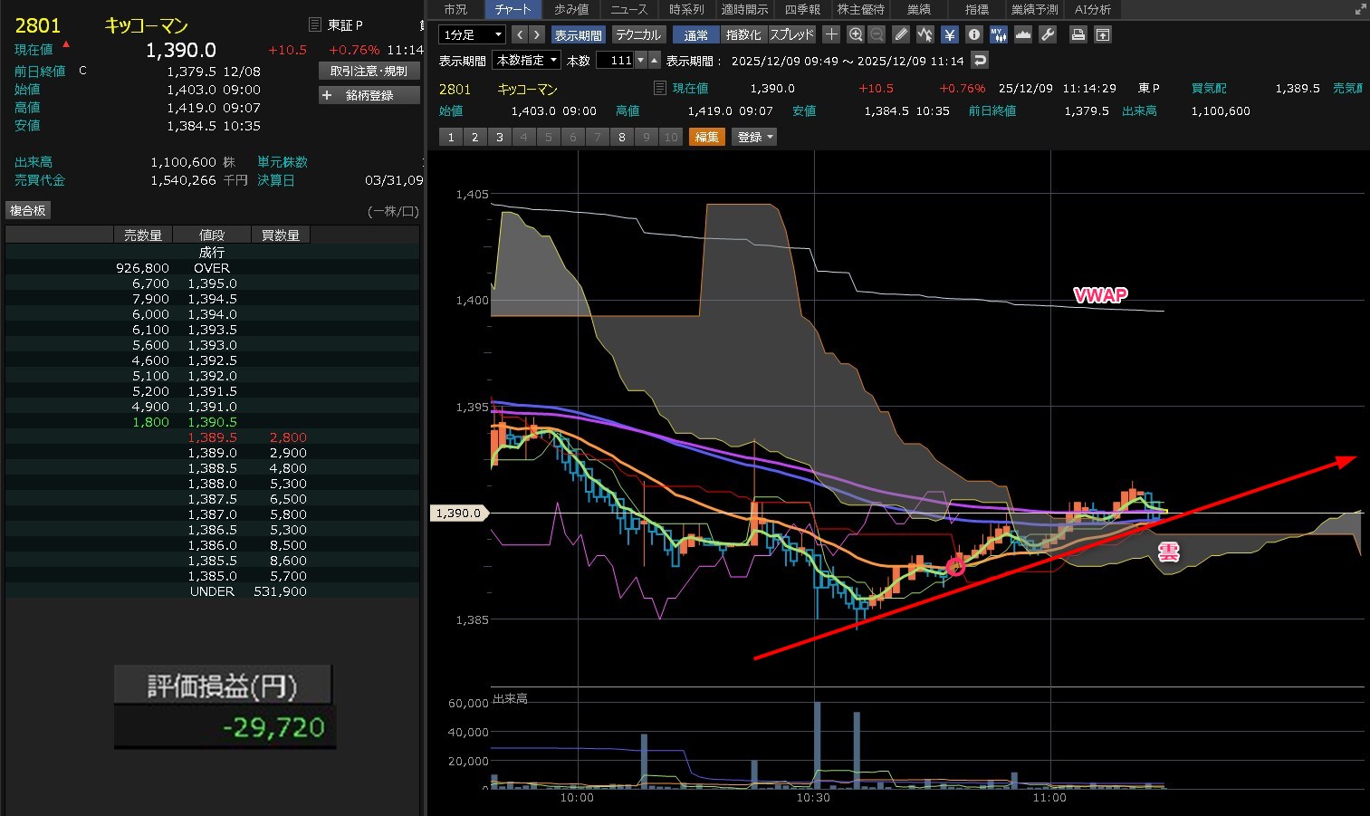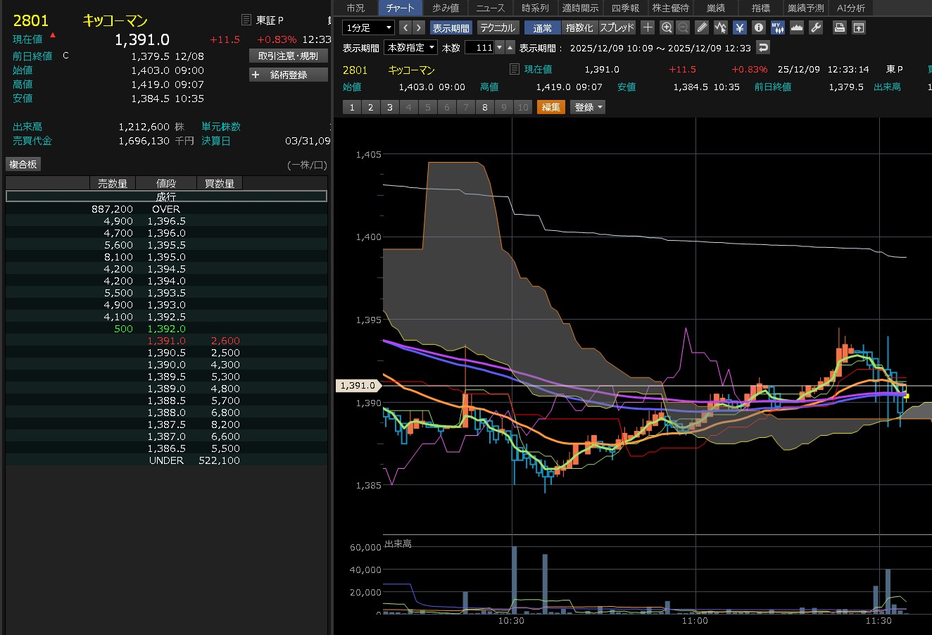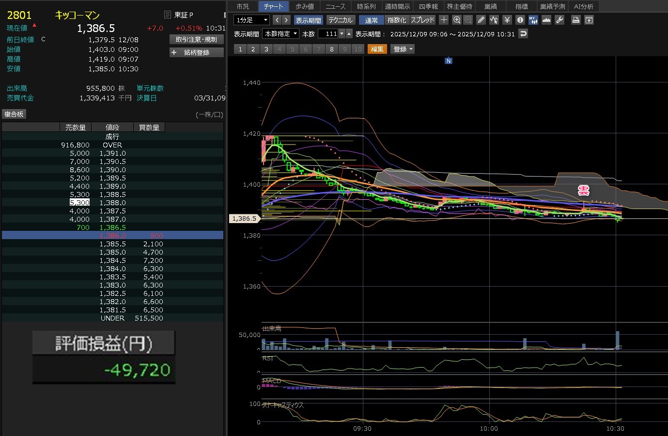 なかなかうまく行きません。さて、今日中に処分する予定でとある株を買いました。キッコマンは今見たら、@1393まで下落してた。買わなくて正解ですね。あとは・・・14:30頃にとある銘柄を追加購入予定。
