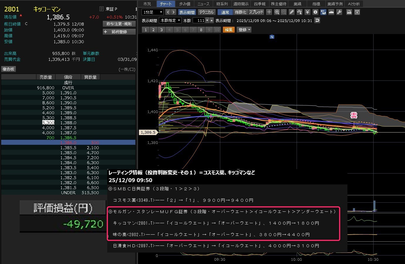 塩野義製薬はずっと狙ってたけど、レーティングSBIやから安心してたら上げていったわ。残念やな。味の素も目先おっきい雲があるから上がらなさそうや。キッコーマンはまた落ちてきた。含み損が3万超えてるわ。1380になったら追加購入するかな。モルガン・スタンレーのレーティングは当てにならないのよね。この時間帯にして本日の安値来たね。日経上げてるのに・・・