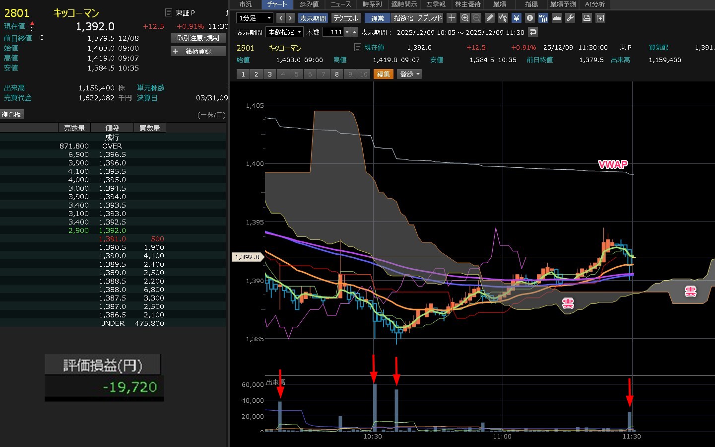 さて、前場が終わりました。売りはドスンと出るね。これロスカットの売りやと思うねん。買いは大きな買いがない。VWAPが超えないと厳しいな。ワイのようなレーティング見て買いに参加した奴が多すぎるねん。