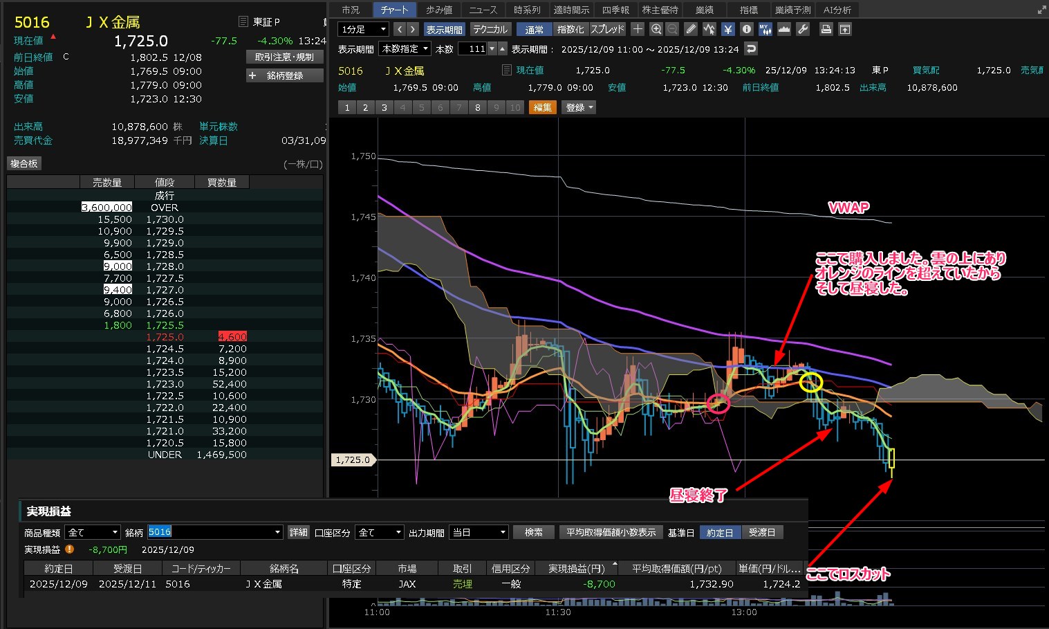 なんとなく下げそうな気がしてた。だから1000株にしたけど、それで正解。直感を信じるべきやね。寝てしまったのは痛いですが・・・そして13:00すぎの高値が13:00前の高値を超えなかったので、そこでロスカットに備える劇でした。そしてVWAPより下だと駄目っすね。
