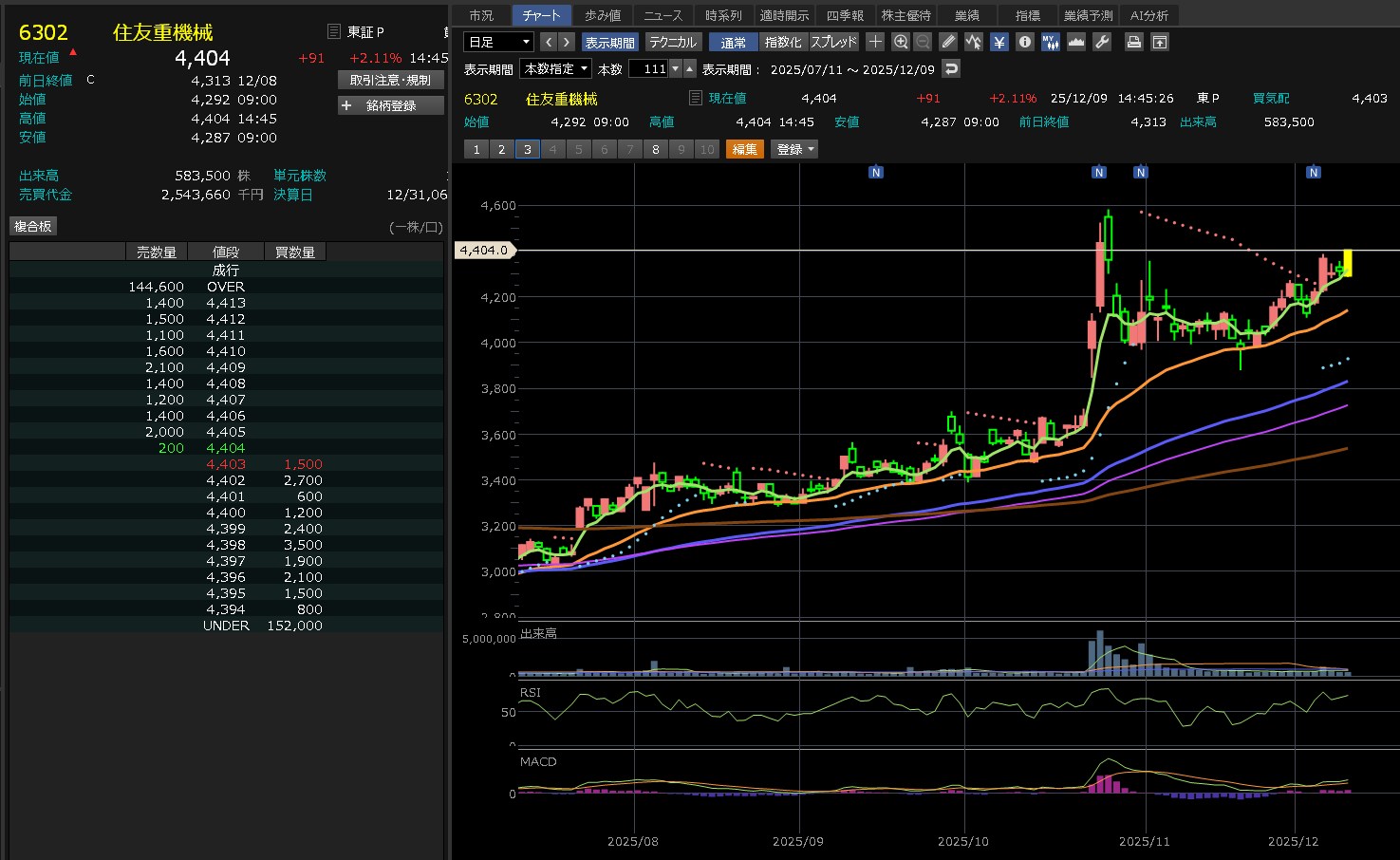 軍事関連が強いっすね。三菱重工、川崎重工だけでなく住友重機械工業まで上げてる。日本製鋼所は言わずもがな。IHIだけなぜか弱い。日本製鋼所は特に流れが変わったね。あの7%意味なく下げたときから比べると強くなったもんや。その意味なく下げたときに買ってたんがワイやで!ホンマになんでやねんって感じでしたけどね。