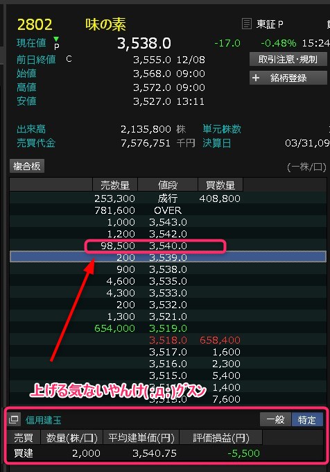 あほが。。。絶対3540って見せ板やろ・・・消えてるやんけ。引けには2400になっとるわ。モルガン・スタンレーのレーティングはあかんな。学ばないと・・・乙でした。今日の取引結果です。マイナス1万円です。キッコーマンは引けピンやのになんでやねん。モルガン・スタンレー・・・