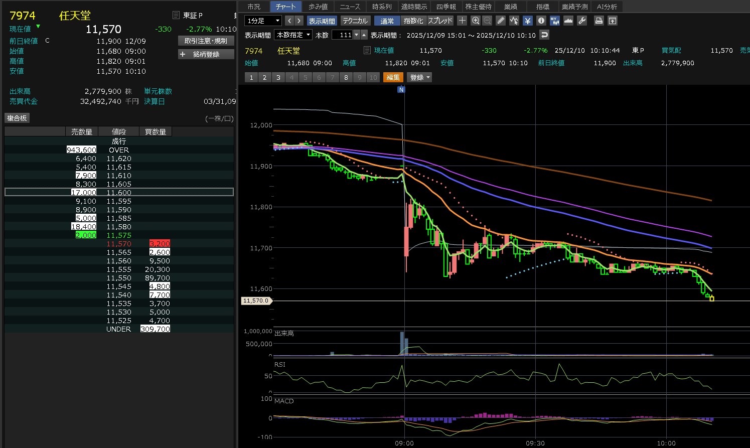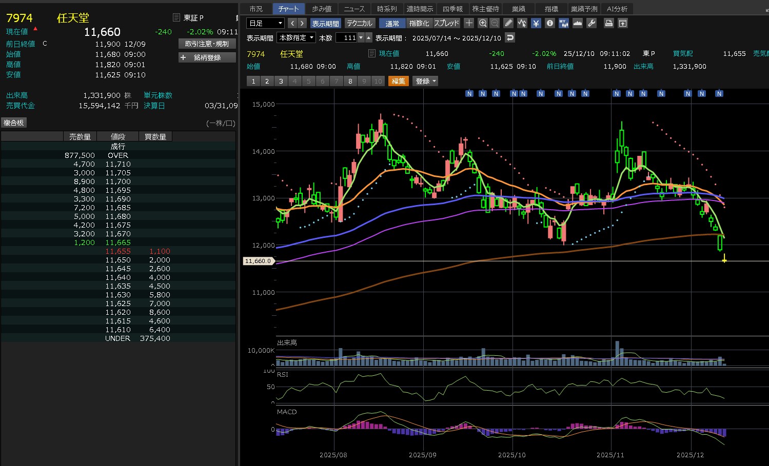 任天堂って四空じゃないの?日経の下げにも連動してきた。やばいね。これ・・・11600は割り込むね。